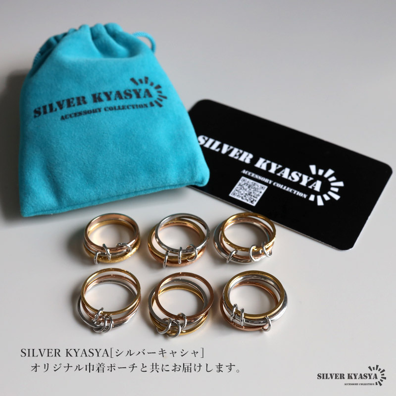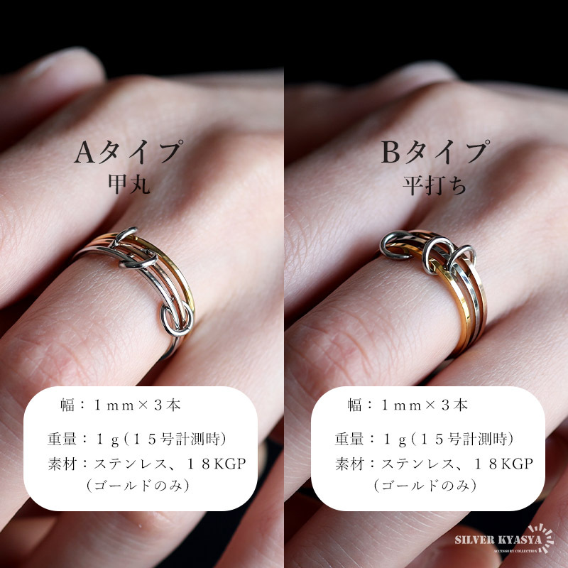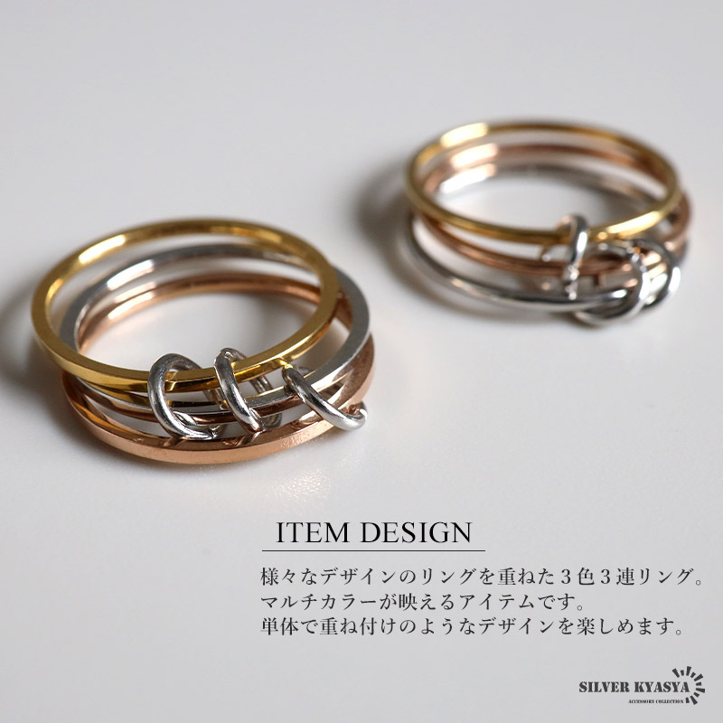 様々なデザインのリングを重ねた3色3連リング。マルチカラーが映えるアイテムです。単体で重ね付けのようなデザインを楽しめます。