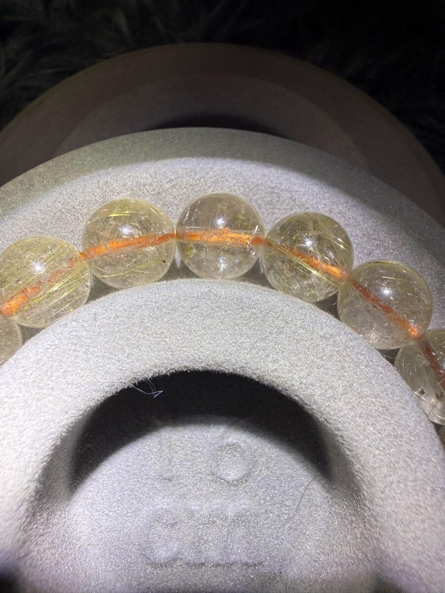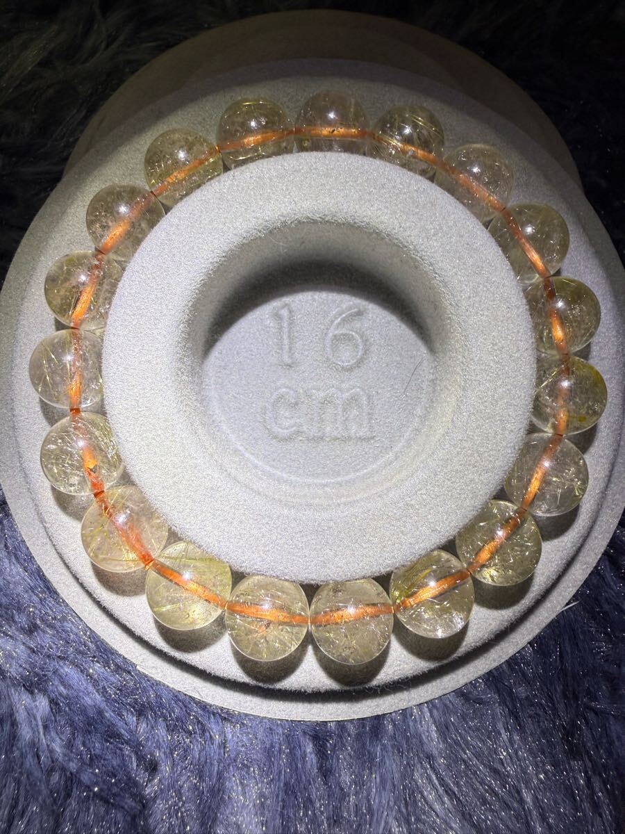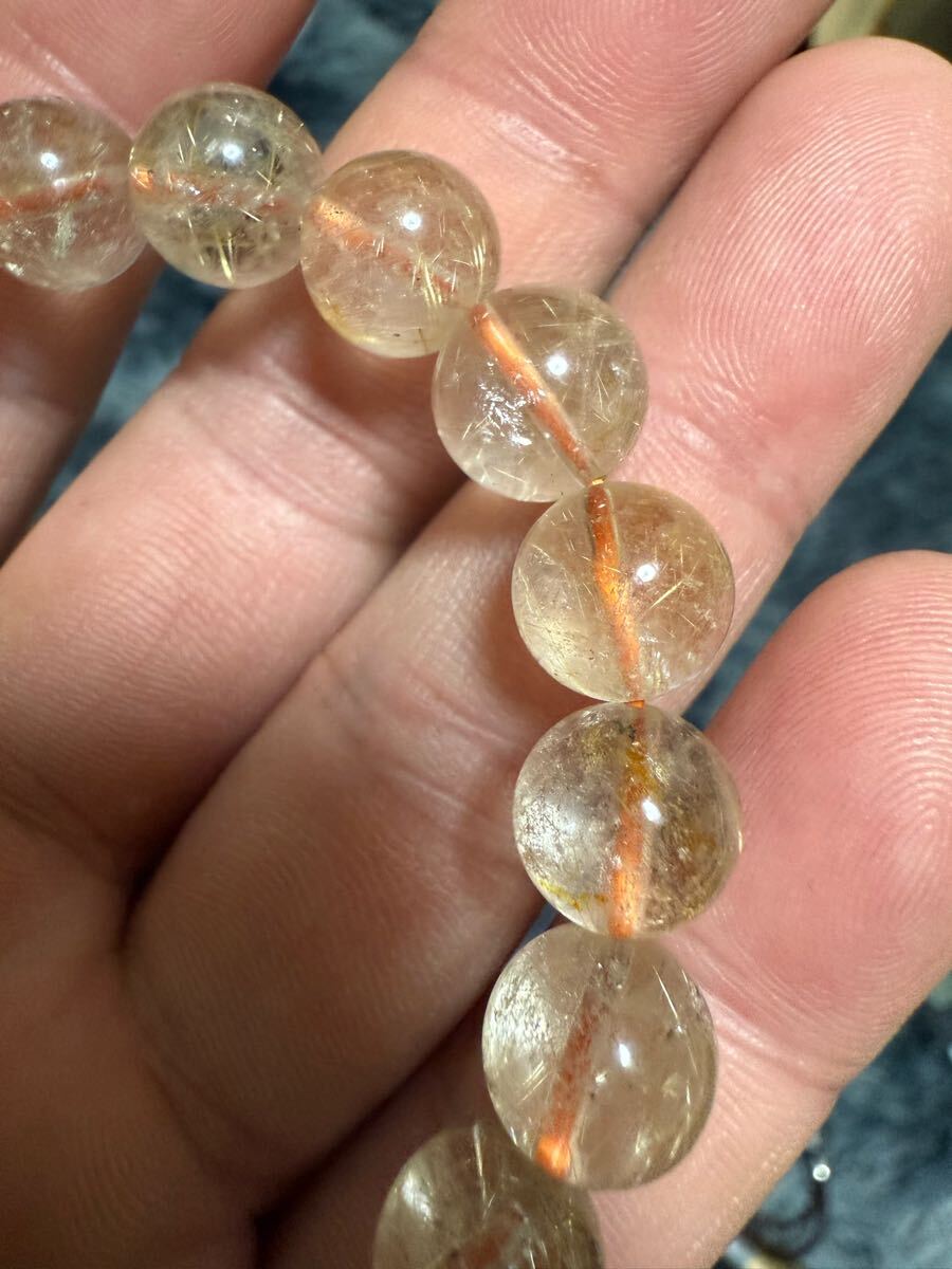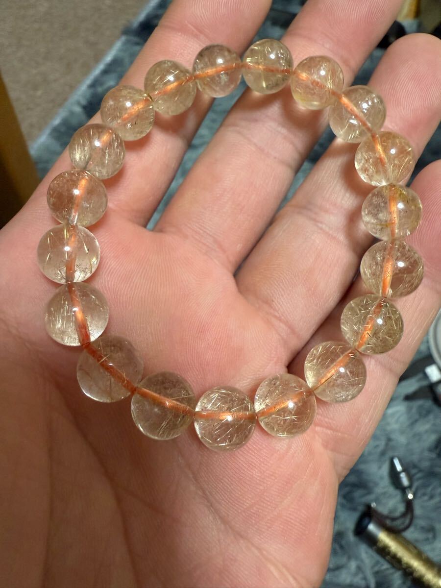 画像のブレスレットに8㎜玉の金針タイチンルチルを2玉足して内径を17㎝〜17.5㎝の間くらいに調整しました。