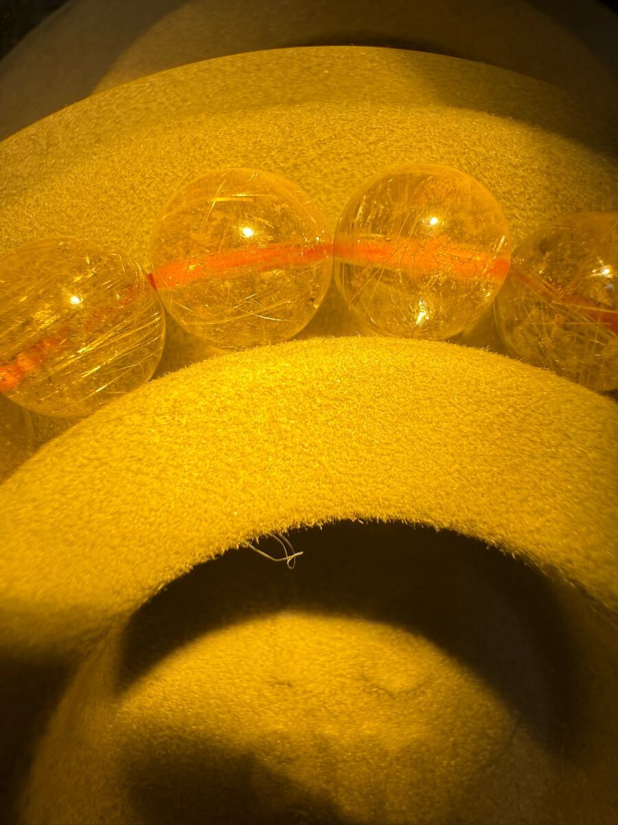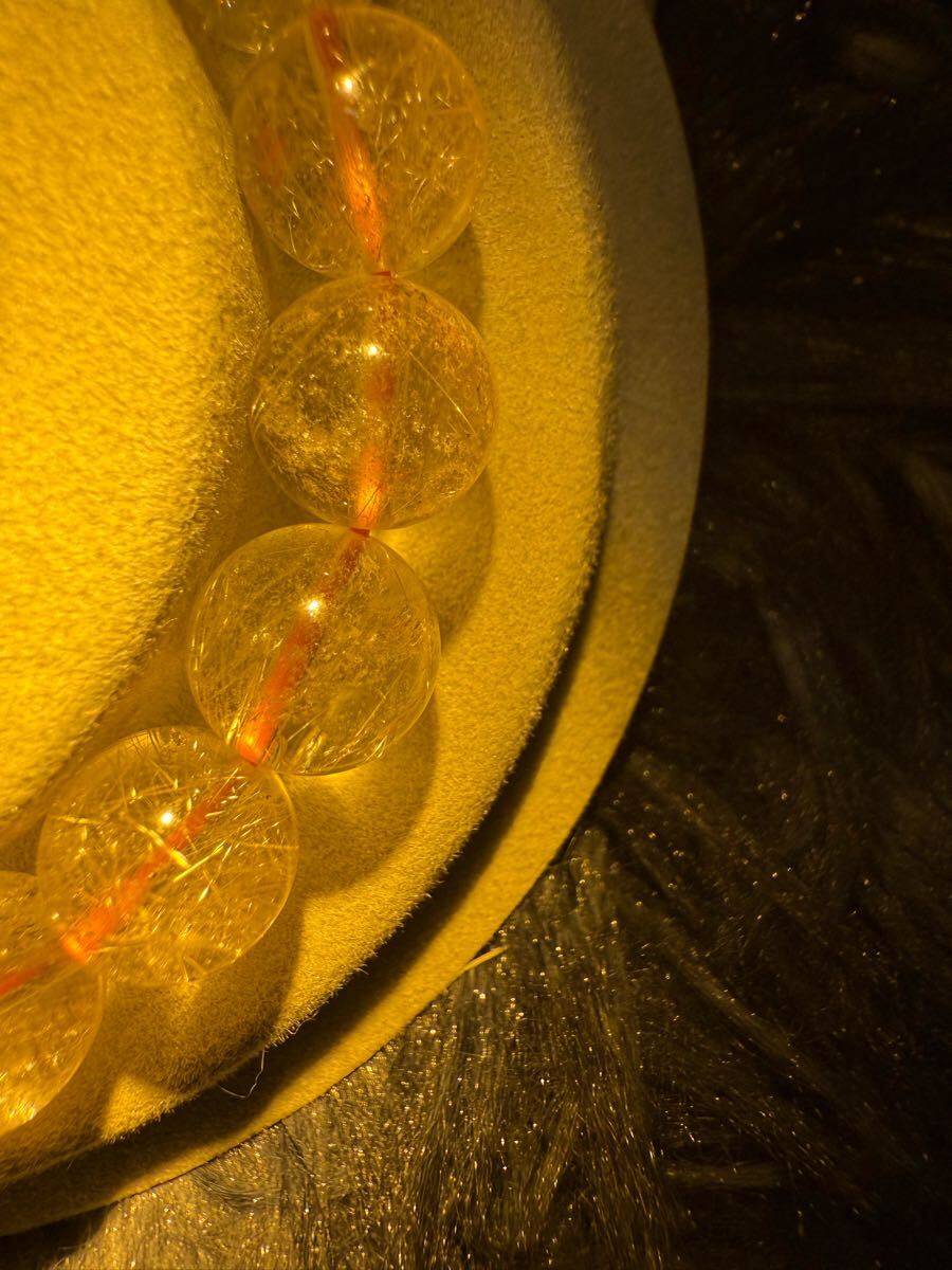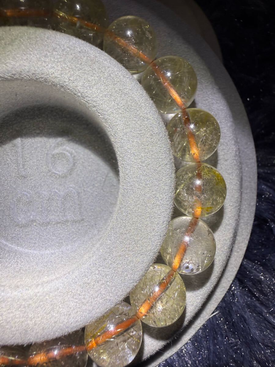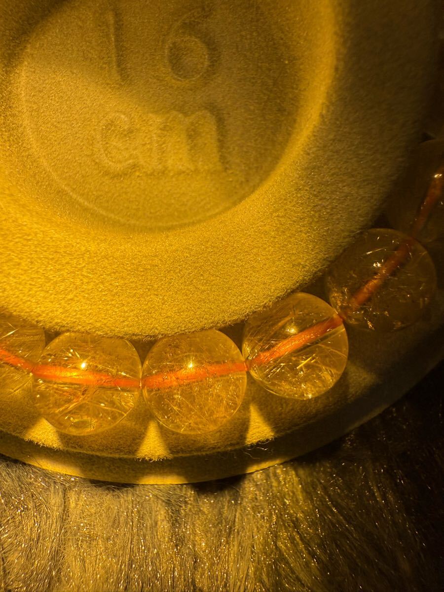 画像のブレスレットに8㎜玉の金針タイチンルチルを2玉足して内径を17㎝〜17.5㎝の間くらいに調整しました。