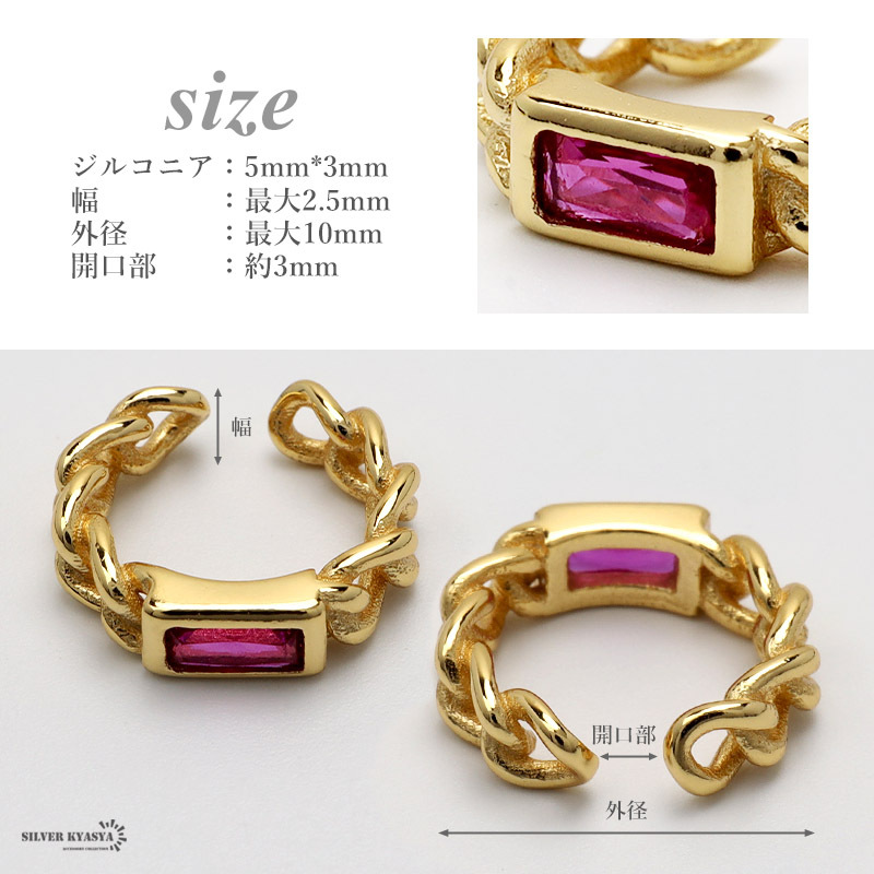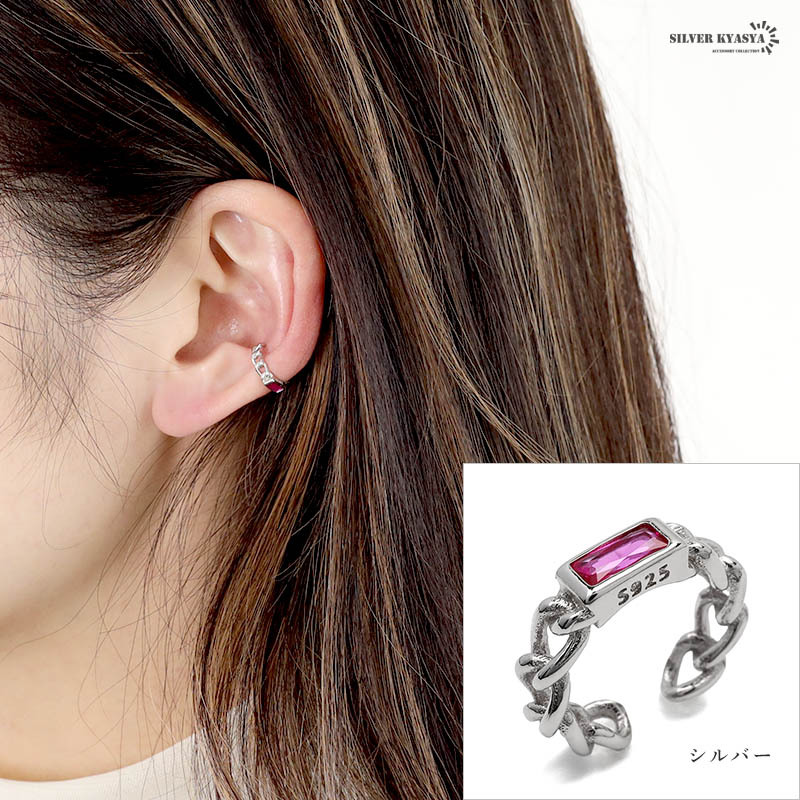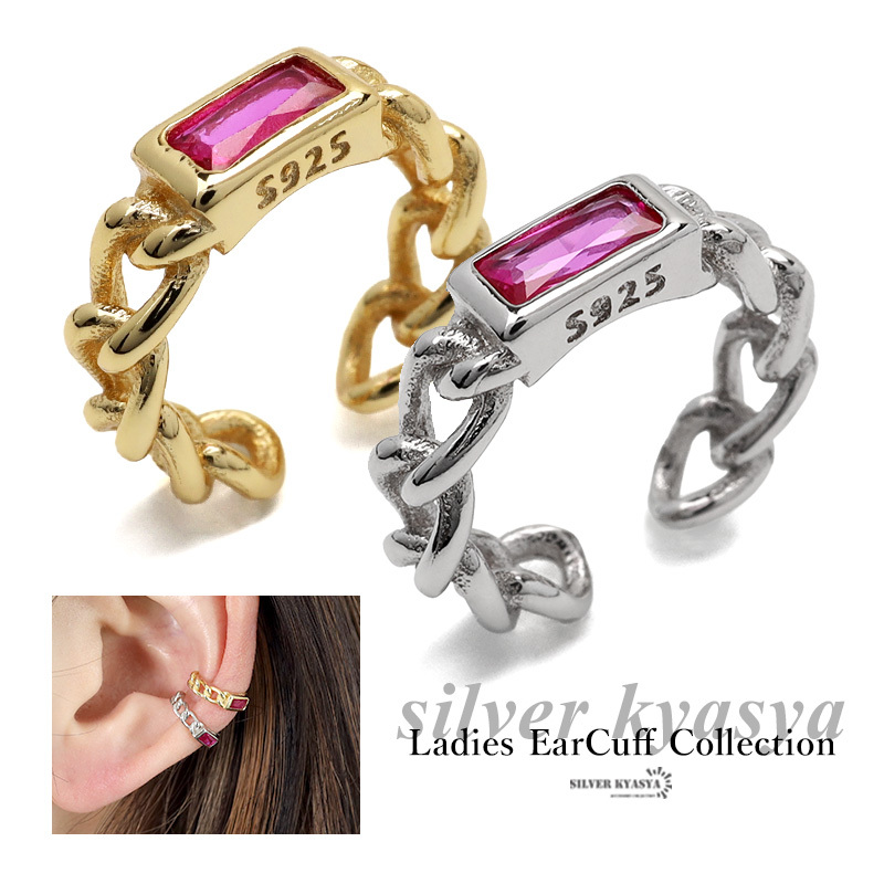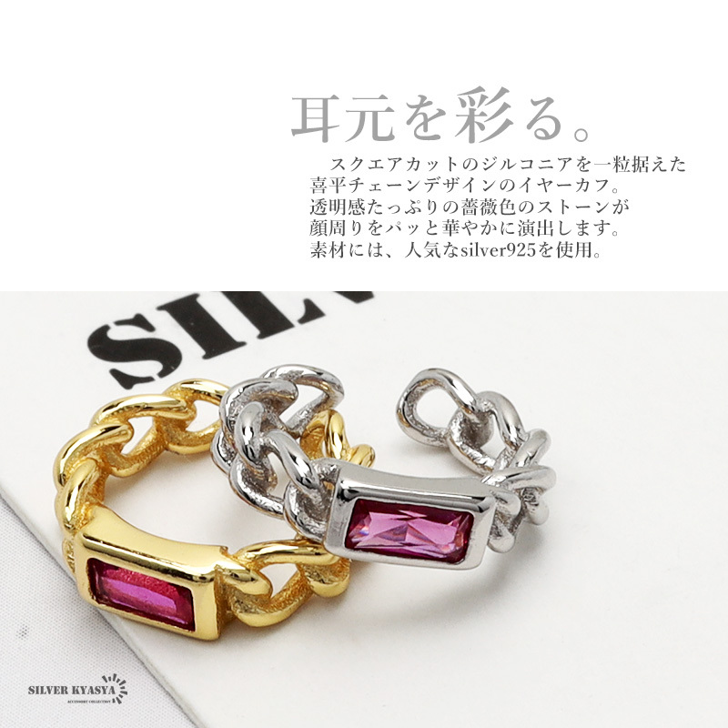 ジルコニアを一粒据えた喜平チェーンイヤーカフ。透明感たっぷりの薔薇色のストーンが顔周りをパッと華やかに演出します。