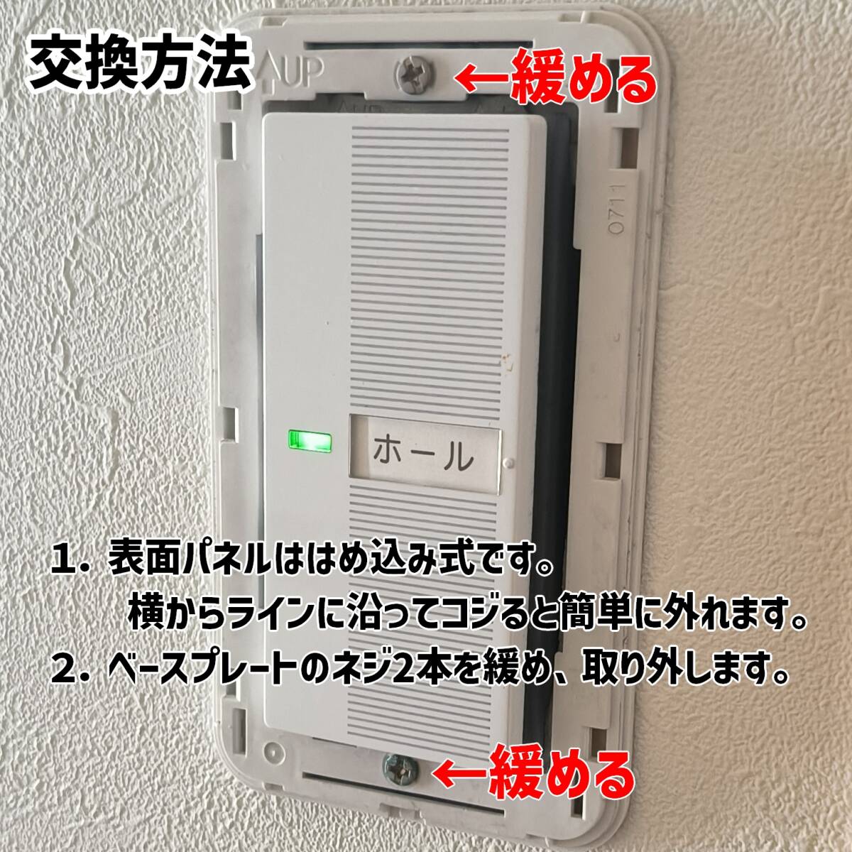 表面パネルと、2本のネジを緩めてベースプレートを取り外し、付属の専用ネジでデコレーションパネルを取り換える簡単取り替え。