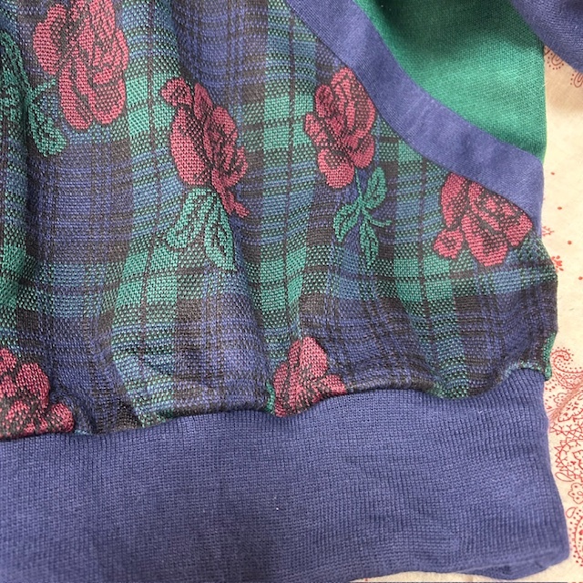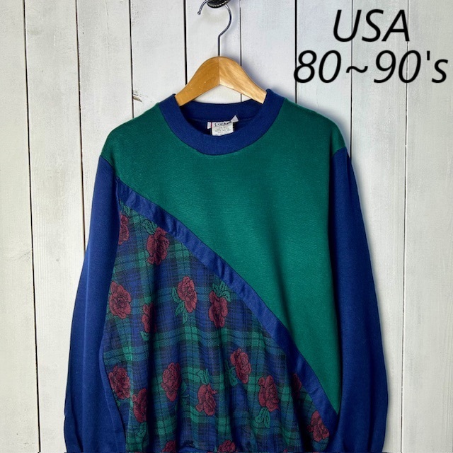 ●商品説明・・・アメリカ古着になります。80年代~90年代前半頃のオールド・ヴィンテージの前身頃がブラックウォッチチェックのバラ柄や色の切替えになったスウェットです。ライトオンス(やや薄手)な感じの裏も起毛していない秋口~春先までカットソー感覚で着ていただけるスウェットで、SAMPLE品の為か素材表記はありませんが、おそらくアクリルかポリ系な感じかと思います。made in USA (アメリカ製)で、色はベースが紺(ネイビー)です。USA S表記で、レディースの方もユニセックスで着ていただけるサイズ感かと思います。
