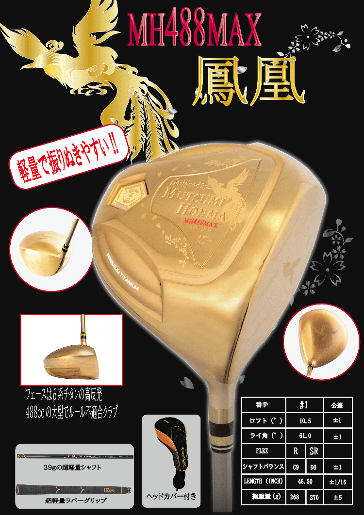 『左用』【高反発・ルール不適同】ゴールド『10.5度:SR』ムツミ ホンマ【NEW MH488MAX 鳳凰ドライバー】送料無料