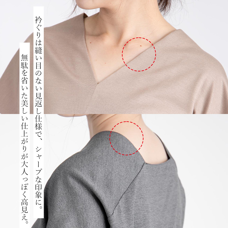 前のVラインがきれいに決まるよう表にステッチ線の出ない見返し仕様で、後ろ姿も美しく魅せるスクエア調ネックになっています