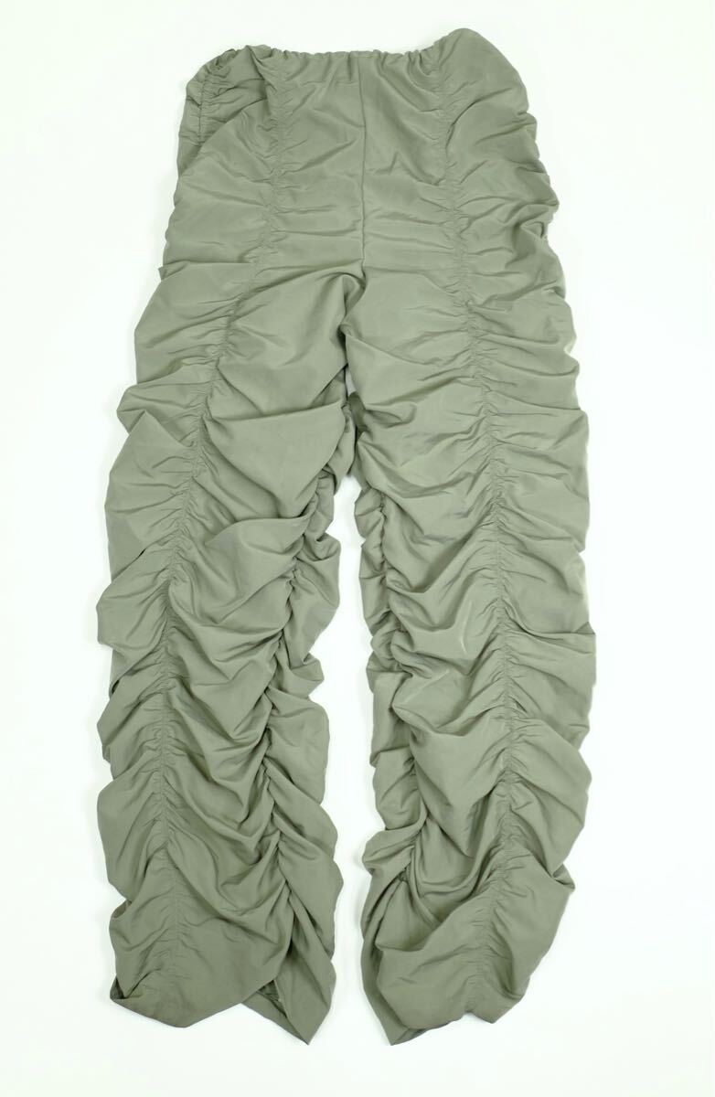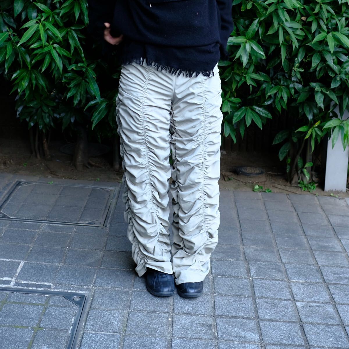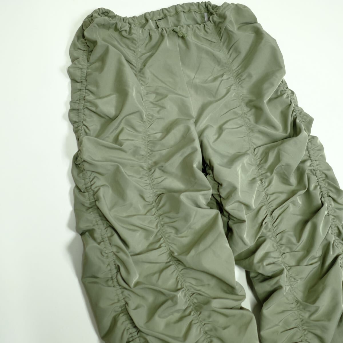 ゴムを全体に通すことによってギャザーのようなシワ感が出ているパンツ。