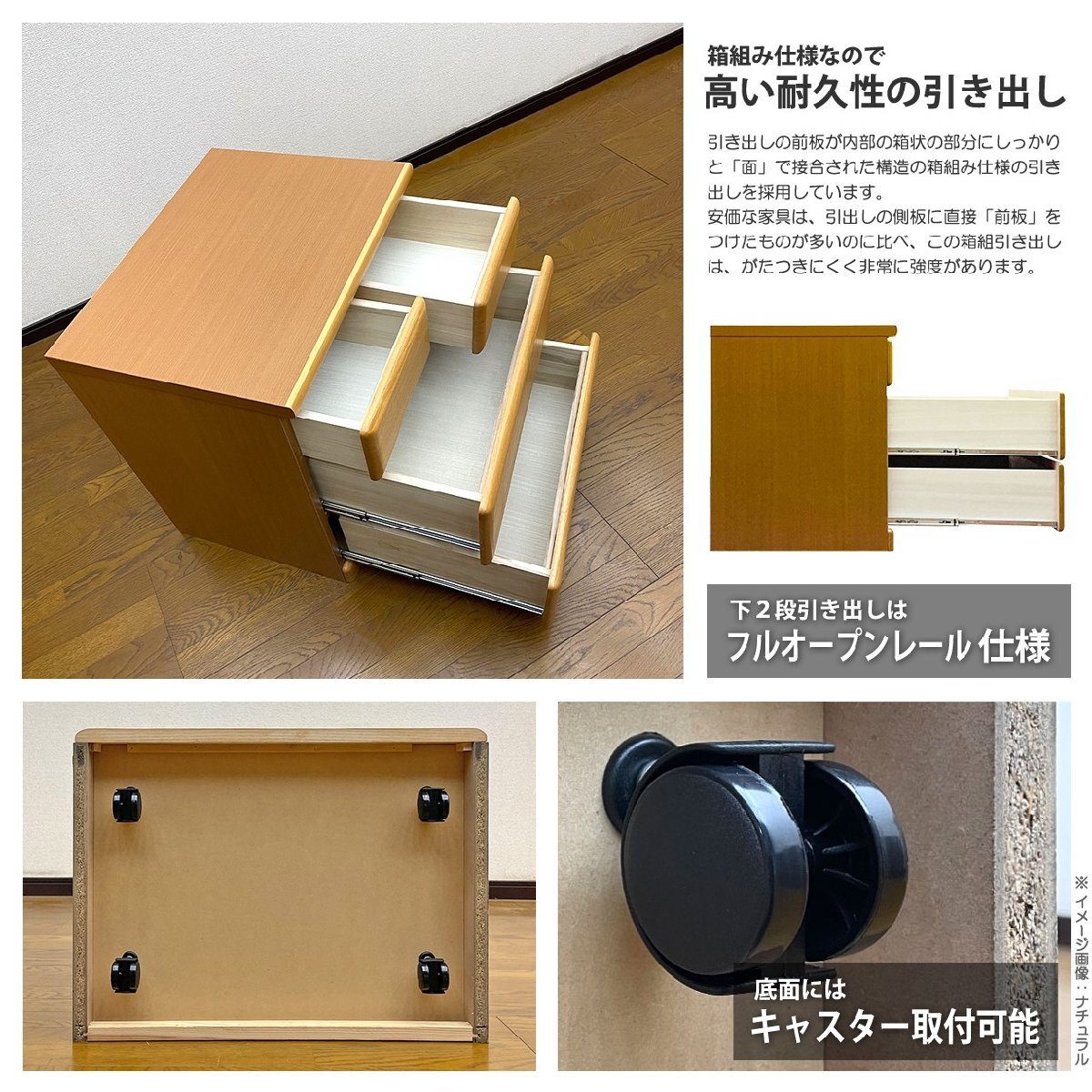 箱状の引出しを作り、そこに前板を付けた構造。(前板の内側に、もう一枚板があるような状態です)安価な家具は、引出しの側板に直接「前板」をつけたものが多い。それに比べ、箱組した引き出しは、がたつきにくく非常に強度があります。