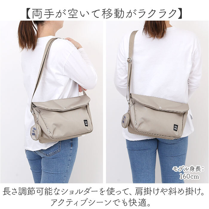 ・長さ調節可能なショルダーを使って、肩掛けや斜め掛け。アクティブシーンでも快適。
