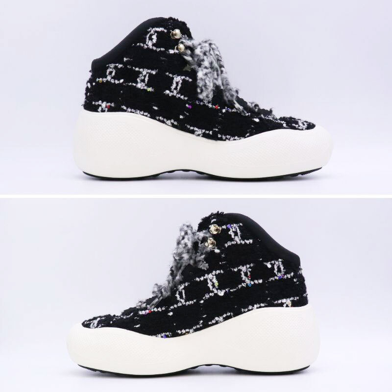 商品名 試着程度美品 CHANEL シャネル 22N ココネージュ ツイードレースアップ スニーカー 厚底 #38 25cm レディース ブラック G39500 送料無料
