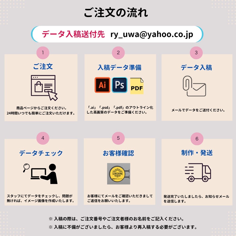 ※お持ちのロゴデータや写真画像、pdfやjpgなどでつくられた原稿などをお送り下さい。