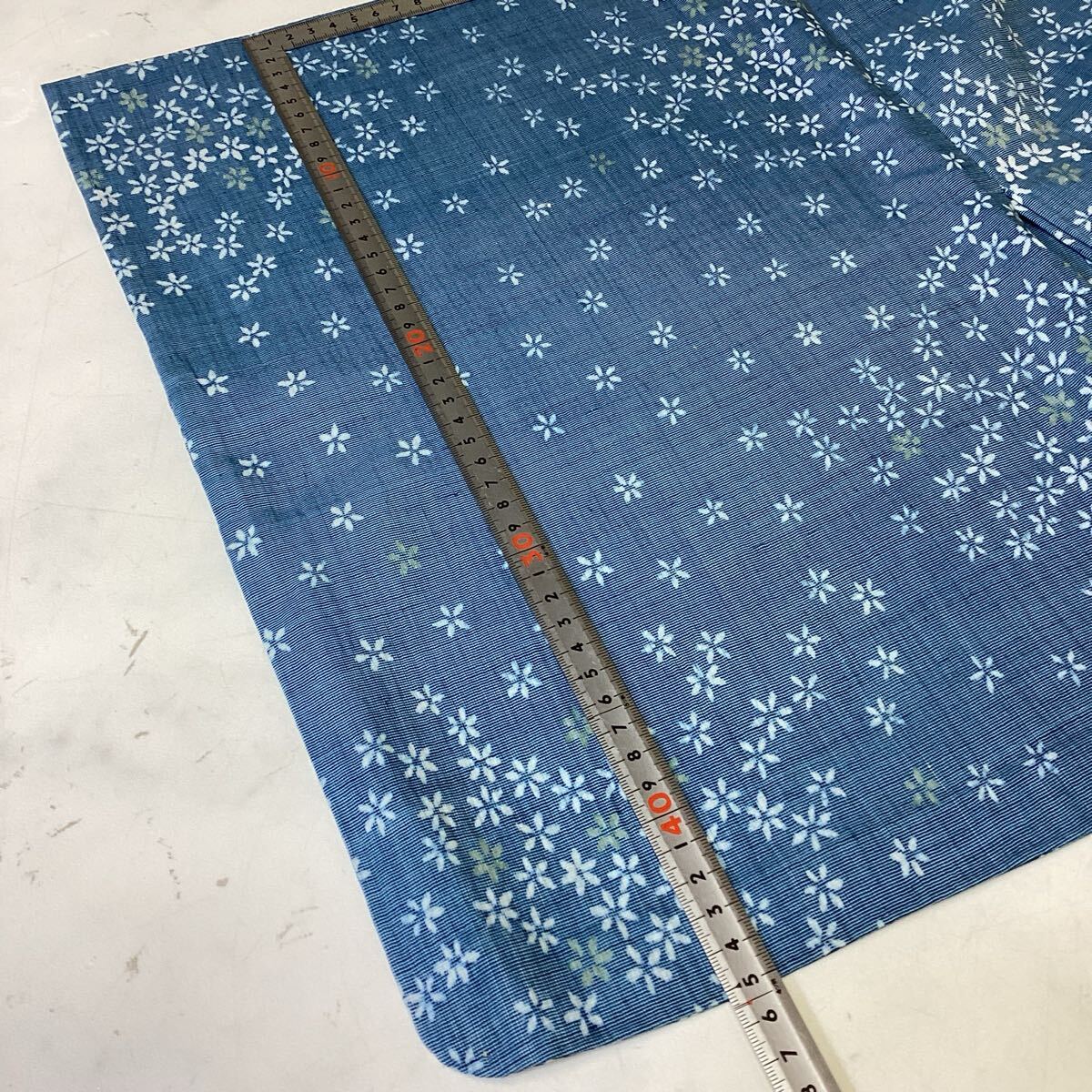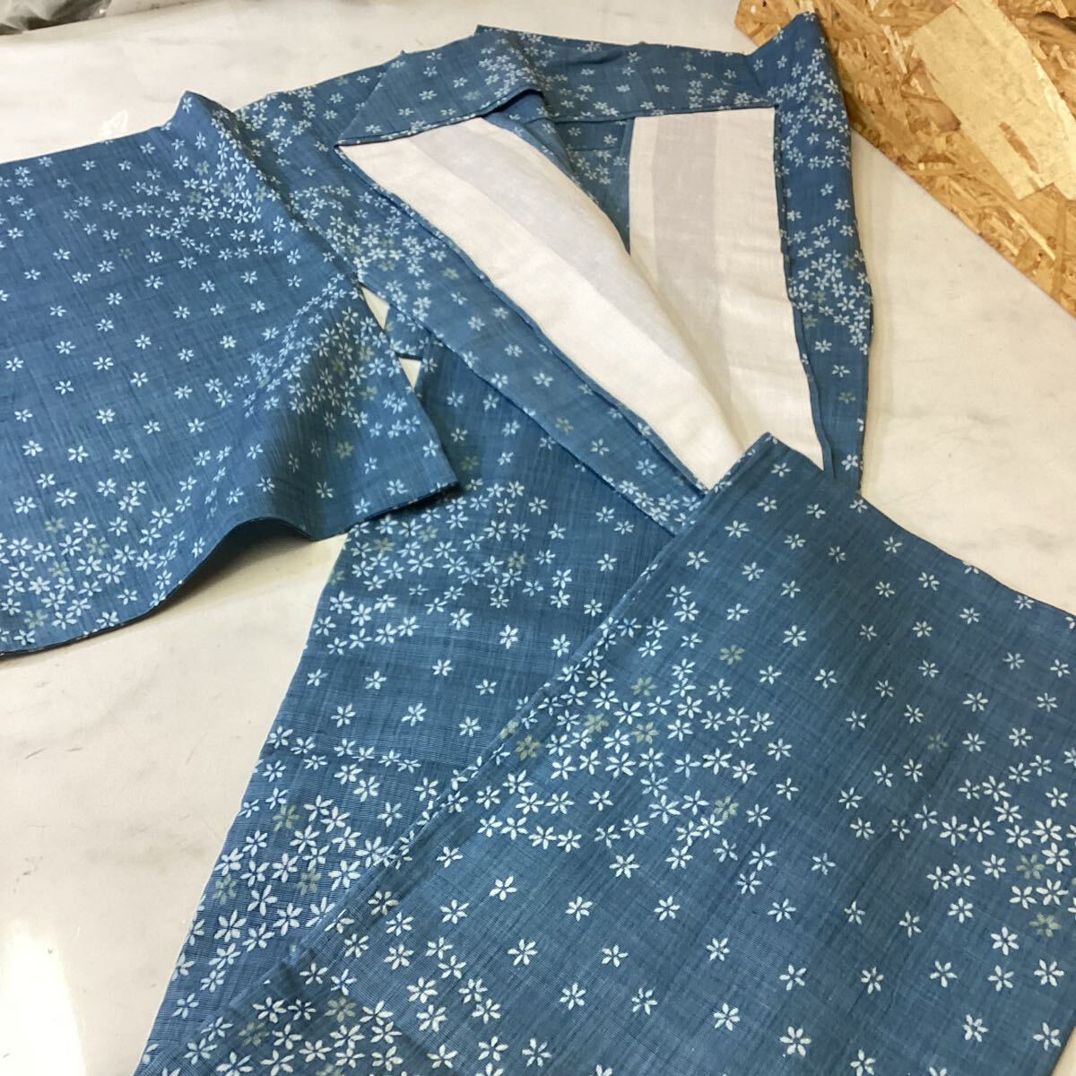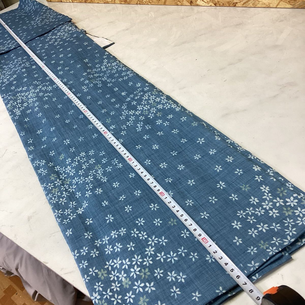 青色の花柄デザインの着物