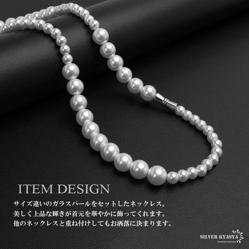 サイズ違いのガラスパールをセットしたネックレス。美しく上品な輝きが首元を華やかに飾ってくれます。他のネックレスと重ね付けしてもお洒落に決まります。