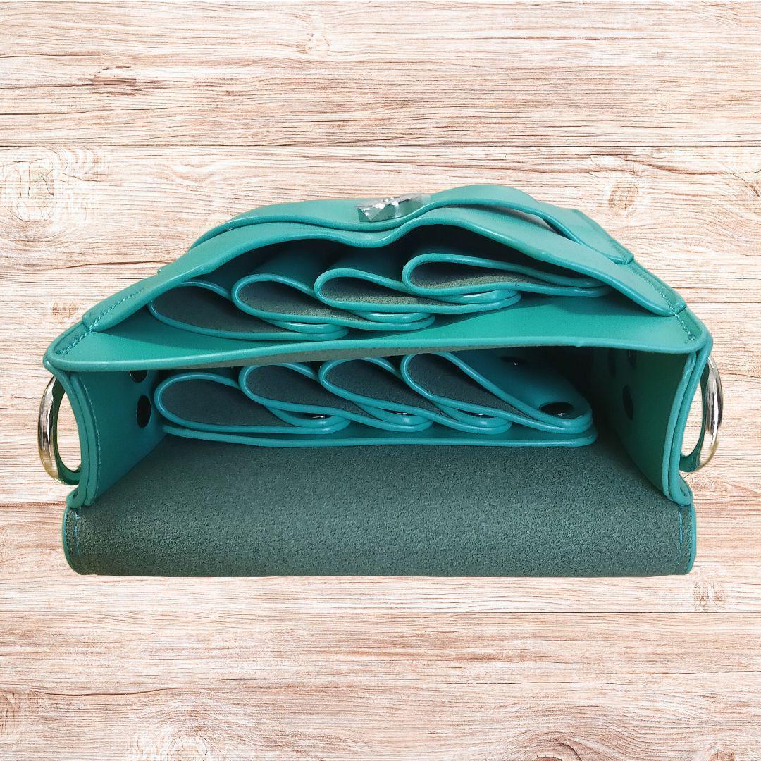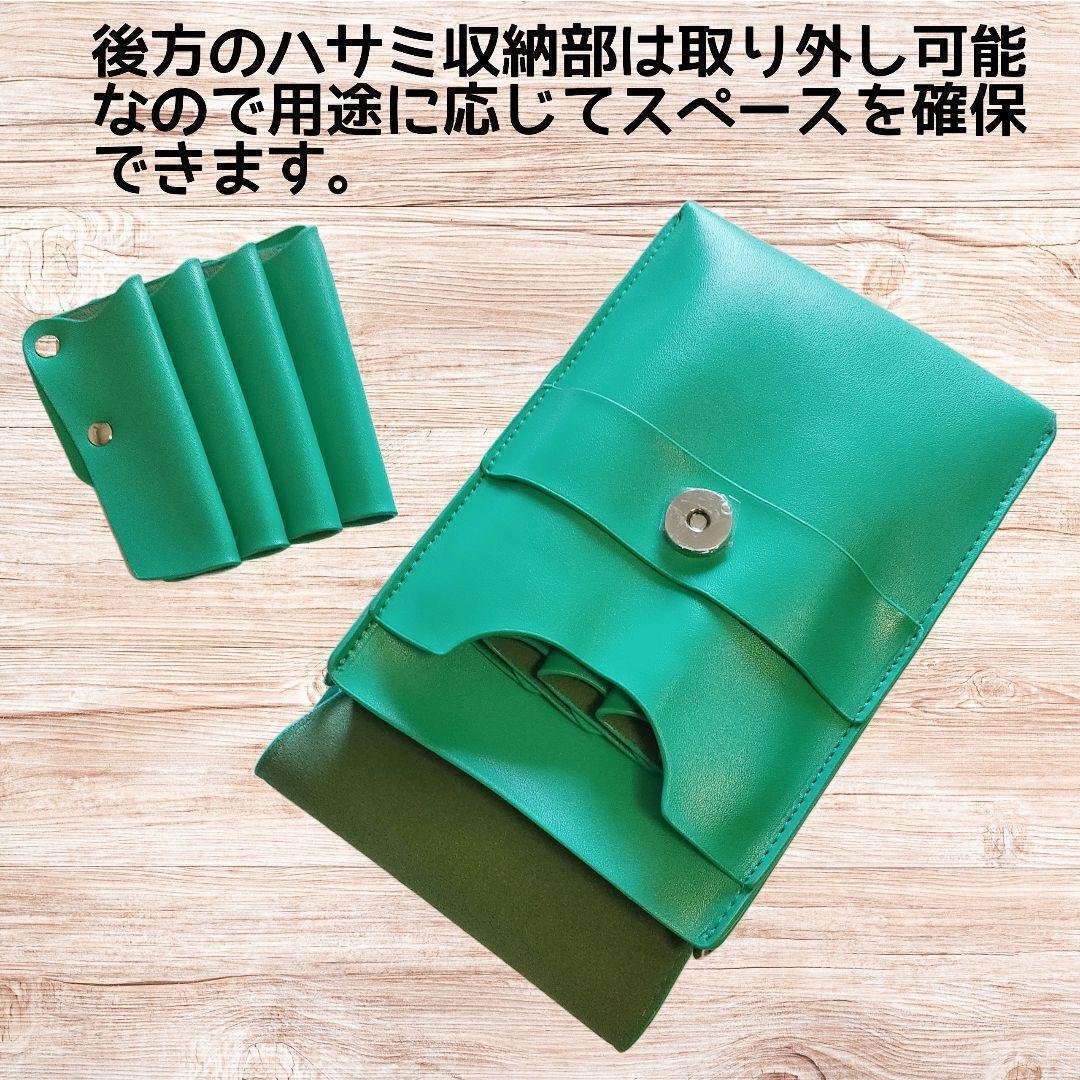 8本のハサミを収納可能です。腰かけベルト付きです。ベルトは最長130cm程ございますので、どのような体型の方にもご使用いただけます。肩掛けも可能でございます。