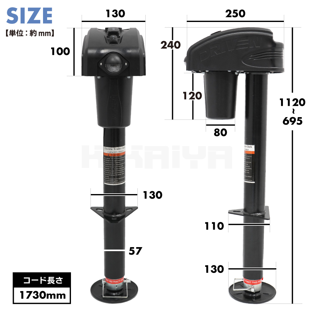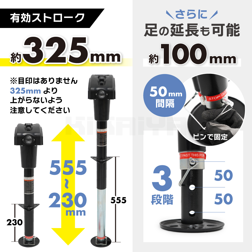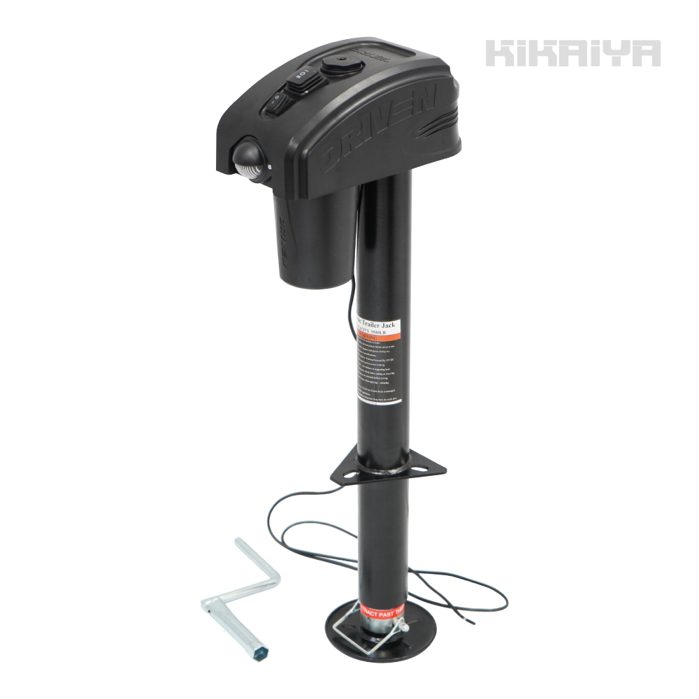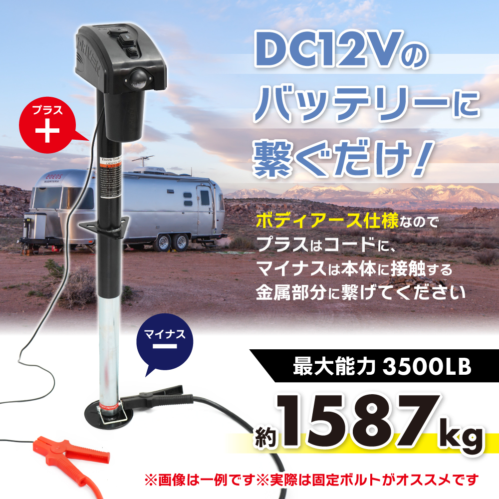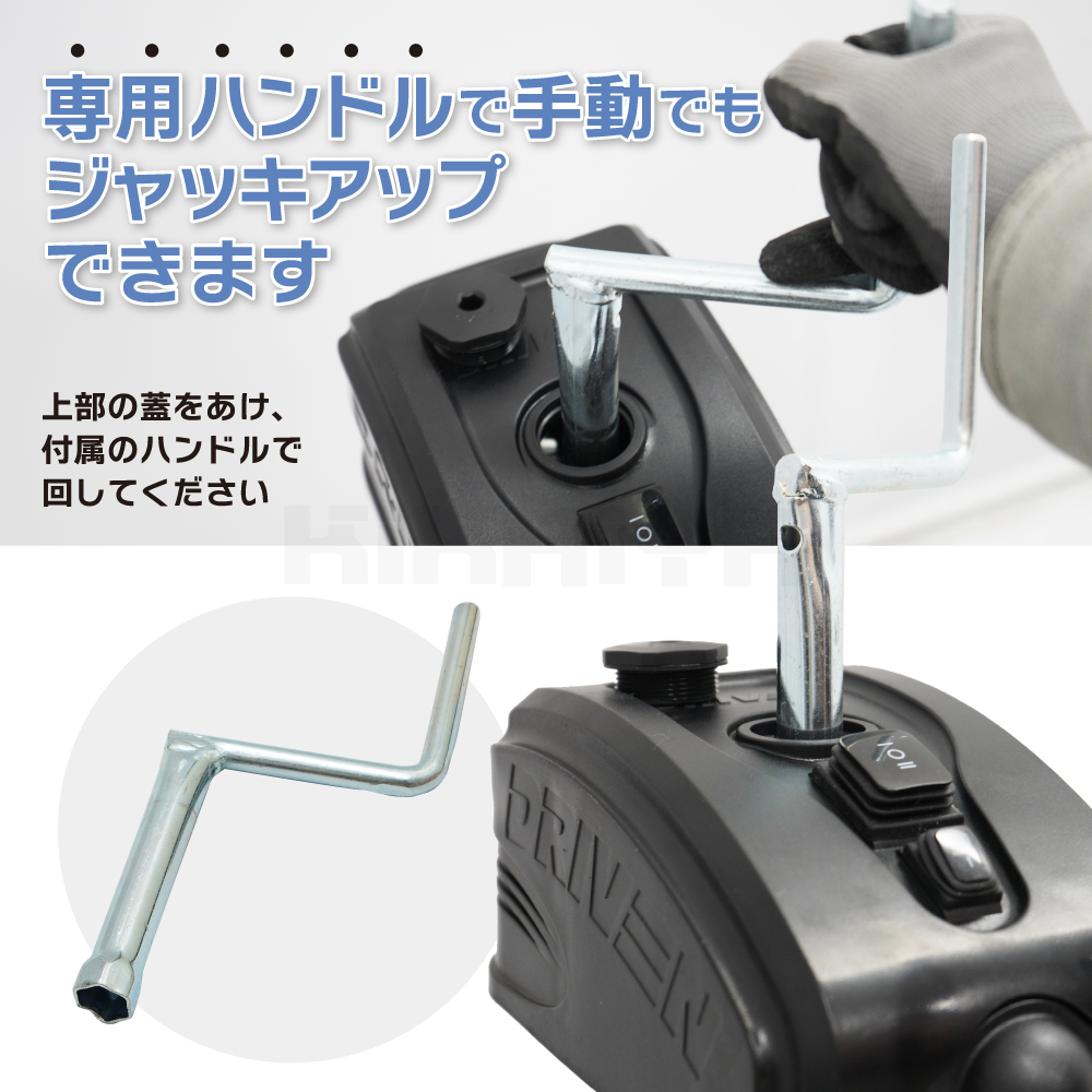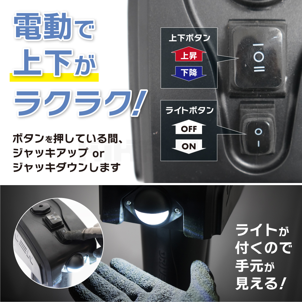 ●プラスは本体コードへ、マイナスは金属部分に接続するボディアース仕様です ●上部のボタンを押すだけで、簡単にジャッキアップ・ダウンできます ●最大能力は約1587kgとパワフルです ●有効ストロークは約325mmあり、電動で約1分20秒ほどで上昇できます ●さらに足が延長でき、50mm間隔で3段階(計100mm)調整できます ●三角の取り付けプレートには穴があいており、ボルトで固定できます ※ボルトは付属しておりません ●暗いときはボタン操作でライトを点灯できます |