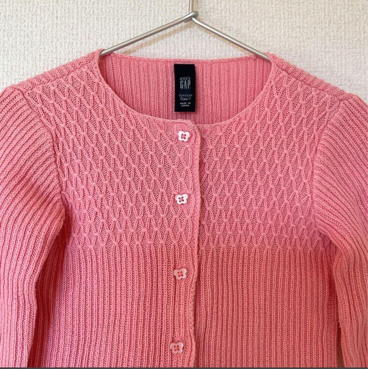 リブ編みのピンクカーディガン、ボタン付きで可愛らしいデザイン。