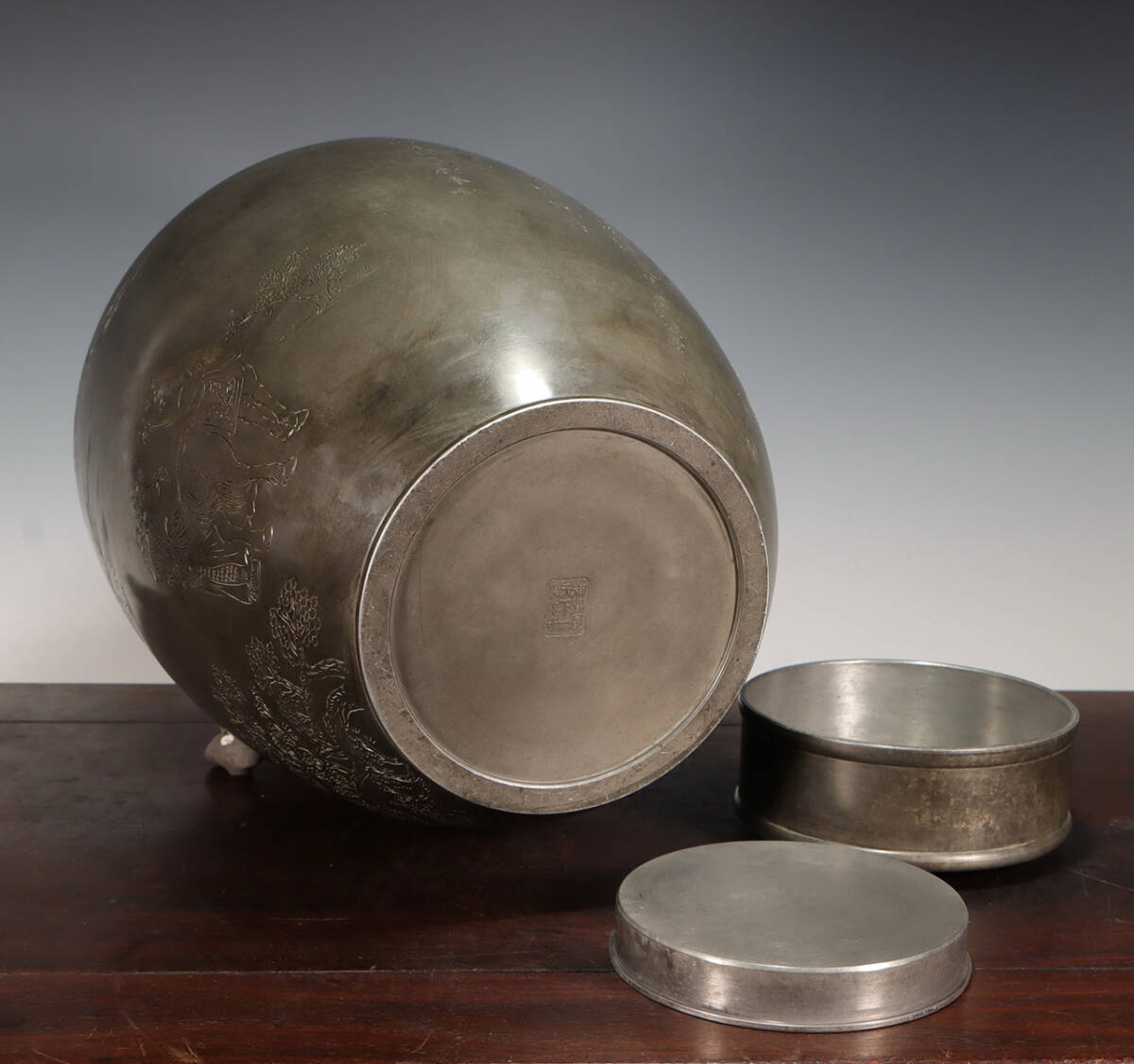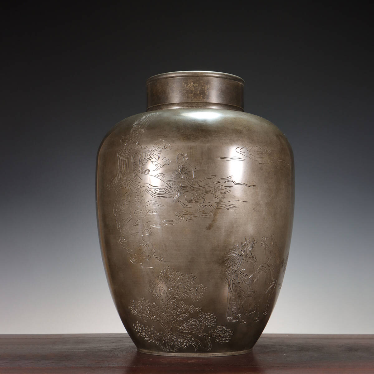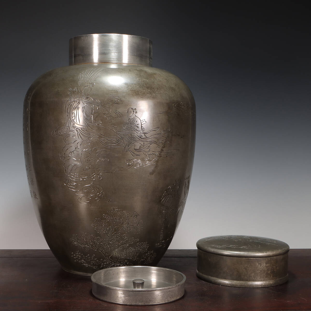 古錫 茶葉罐 御錫屋天下一美作守 造 「錫製人物詩文巨大茶心壺」 茶筒 茶入 茶壷 茶道具 錫肌 金工 茶器 時代物 重5236g | |||