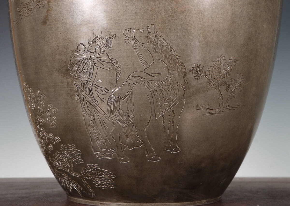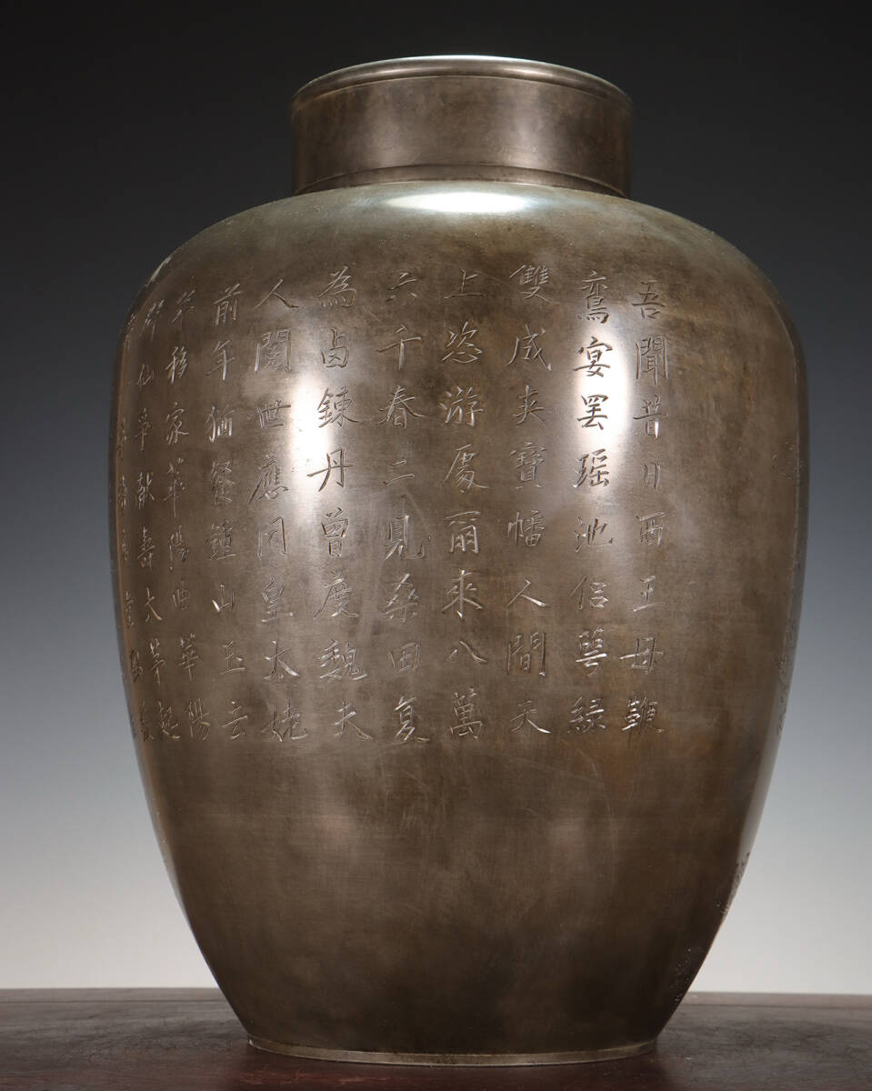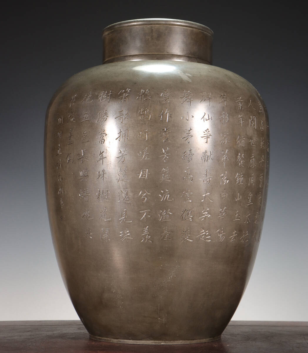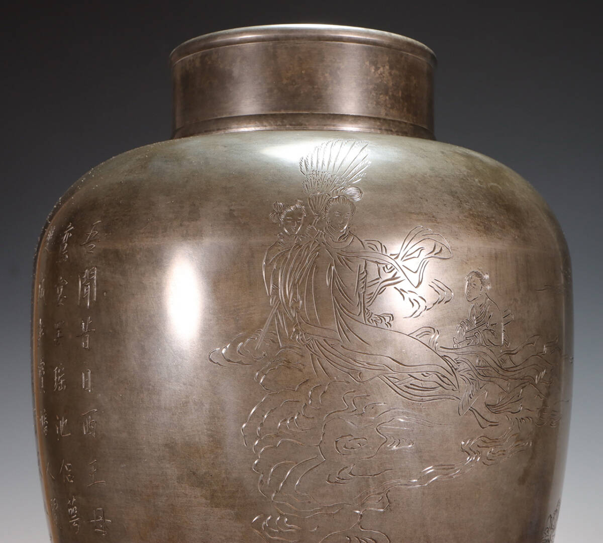 古錫 茶葉罐 御錫屋天下一美作守 造 「錫製人物詩文巨大茶心壺」 茶筒 茶入 茶壷 茶道具 錫肌 金工 茶器 時代物 重5236g | |||