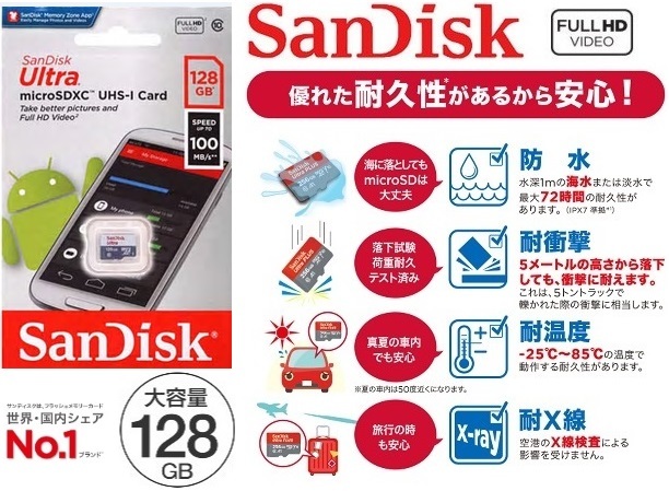 世界でも最高水準の技術をもつサンディスク社製のマイクロSDXCメモリー<br>