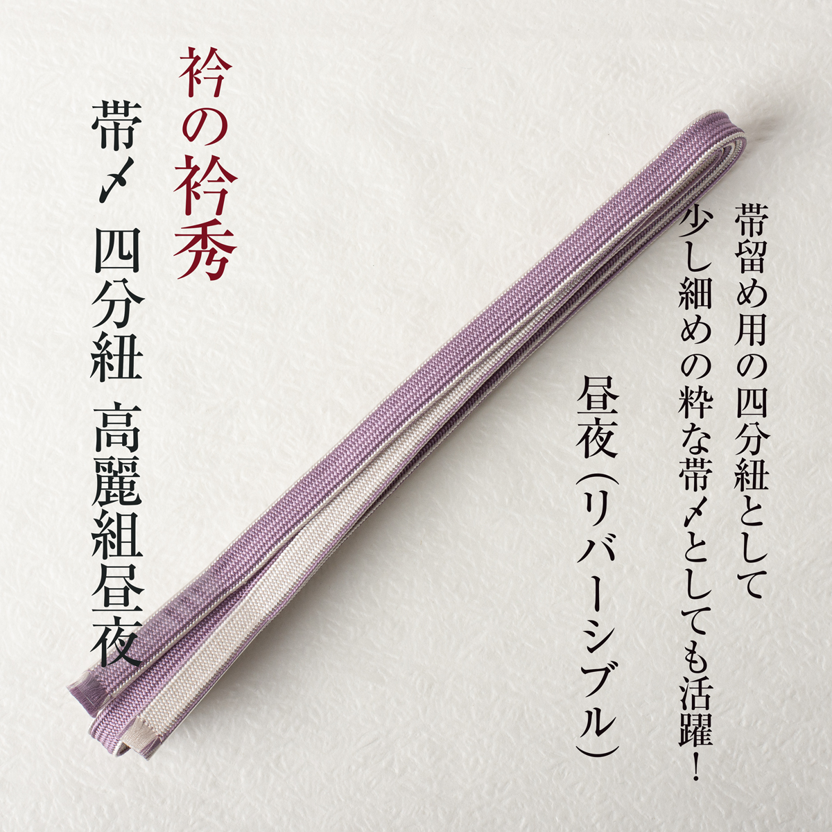 ・三分紐よりやや幅広の四分紐。大きめの帯留めにも馴染み程よい存在感で帯周りを引き締めます。