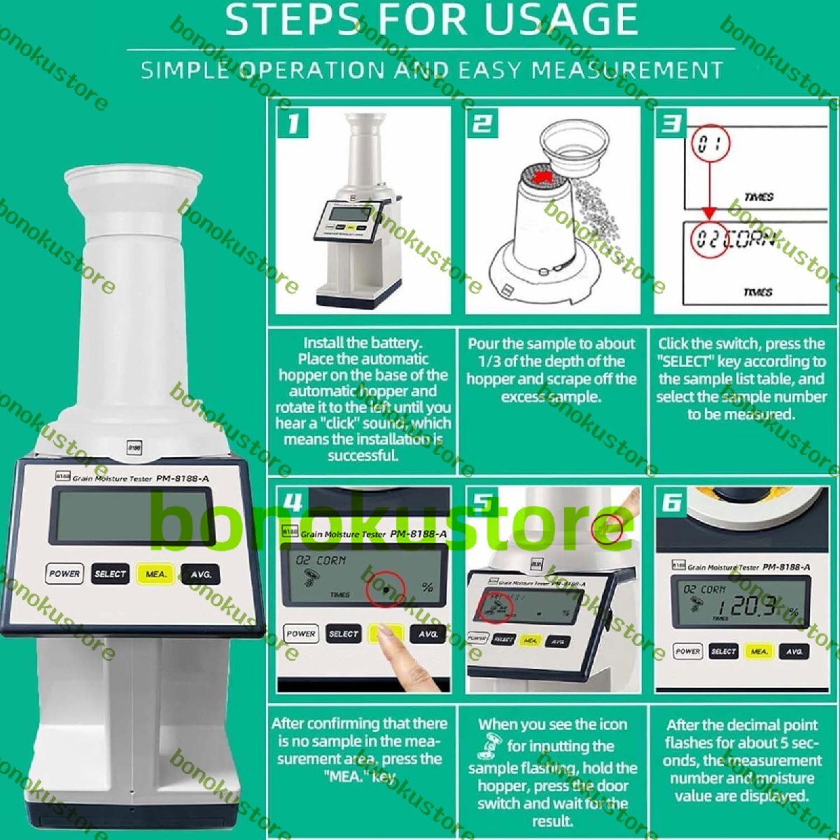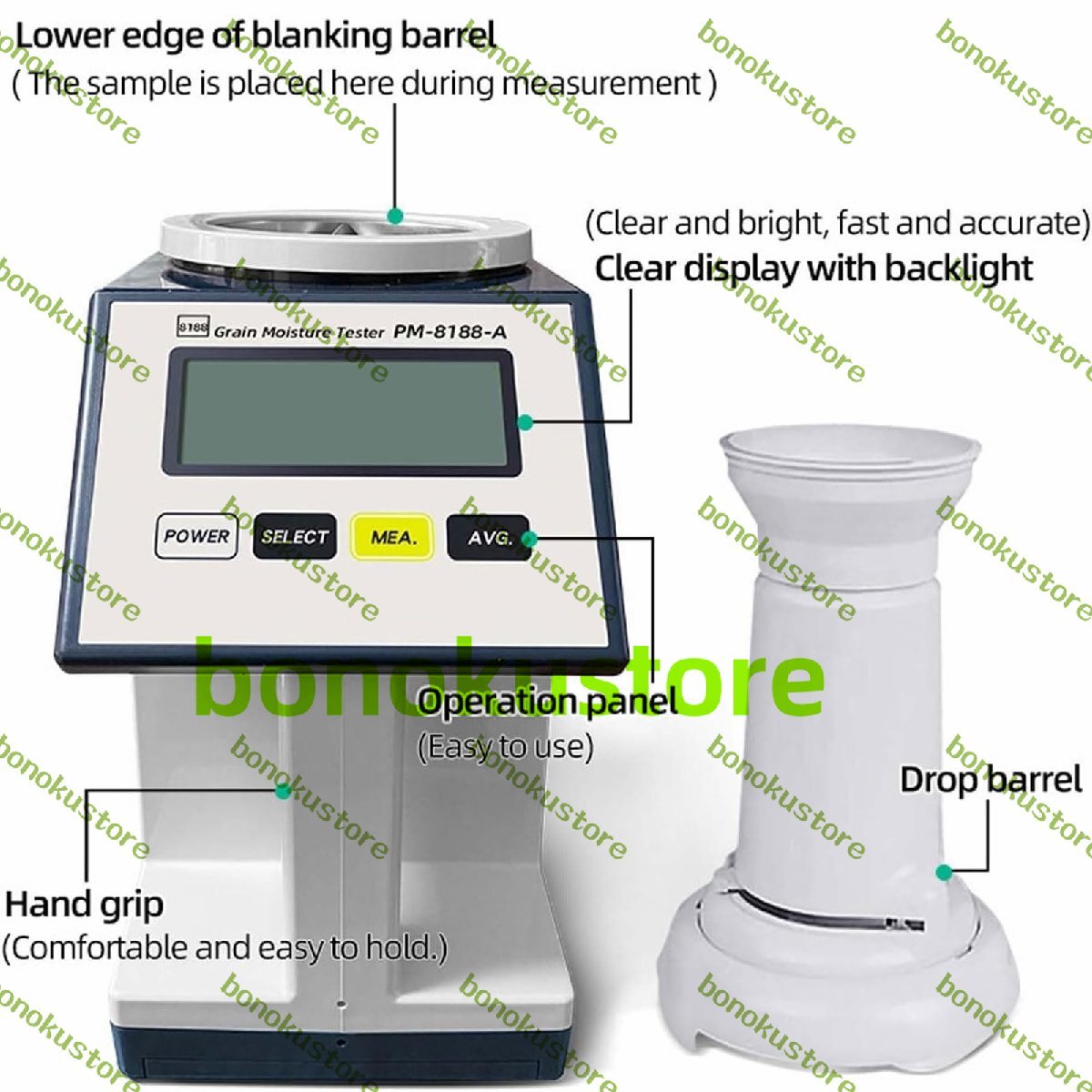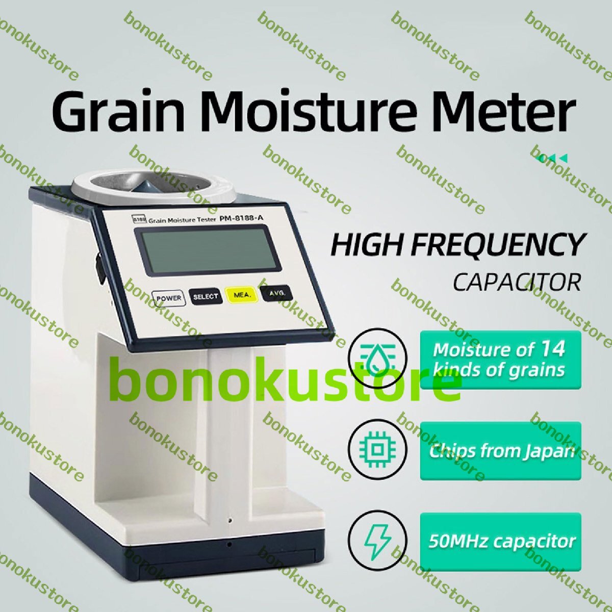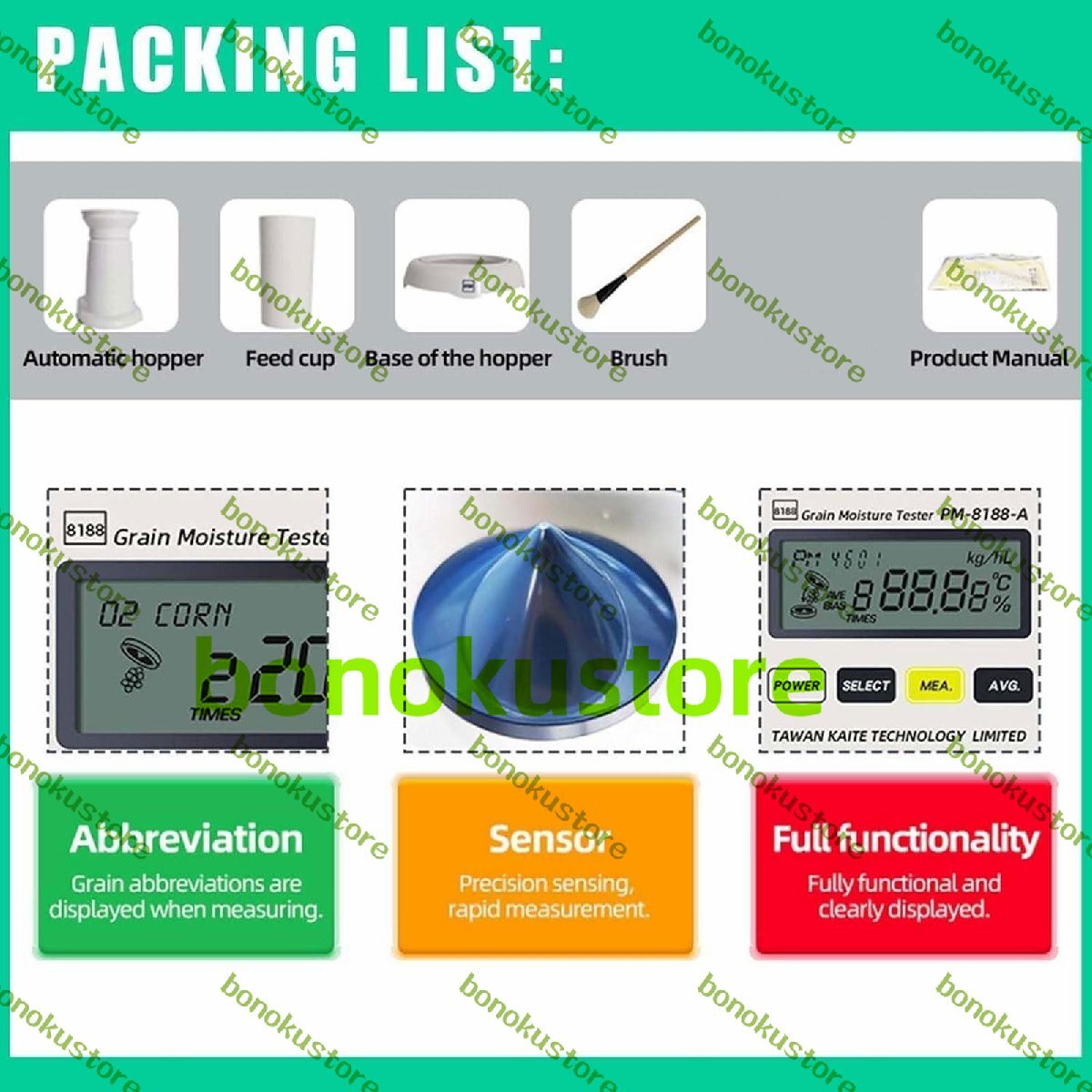 名称: 電子水分計 測定原理:高周波静電容量 測定範囲: 1~40% (サンプルの種類によって異なります) 測定対象:小麦、トウモロコシ、大豆、大麦、緑豆、モロコシ、菜種、落花生、インディカ米、ジャポニカ米、キビ、小豆の14種類の穀物 測定誤差: サンプル容量: 240ml 本体サイズ: 125x205x215mm パッケージ: 穀物水分計1台 自動ホッパー x 1 フィードカップ x 1 ホッパーベース x 1 ブラシ x 1 製品マニュアル x 1