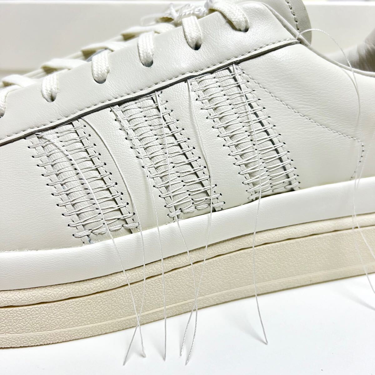 アイステイ、ヒールタブ、ミッドソール、スリーストライプスの周りに「刺し子」からインスパイアされた同系色のステッチを施し、すべての糸をゆるく垂らした印象的なデザイン。