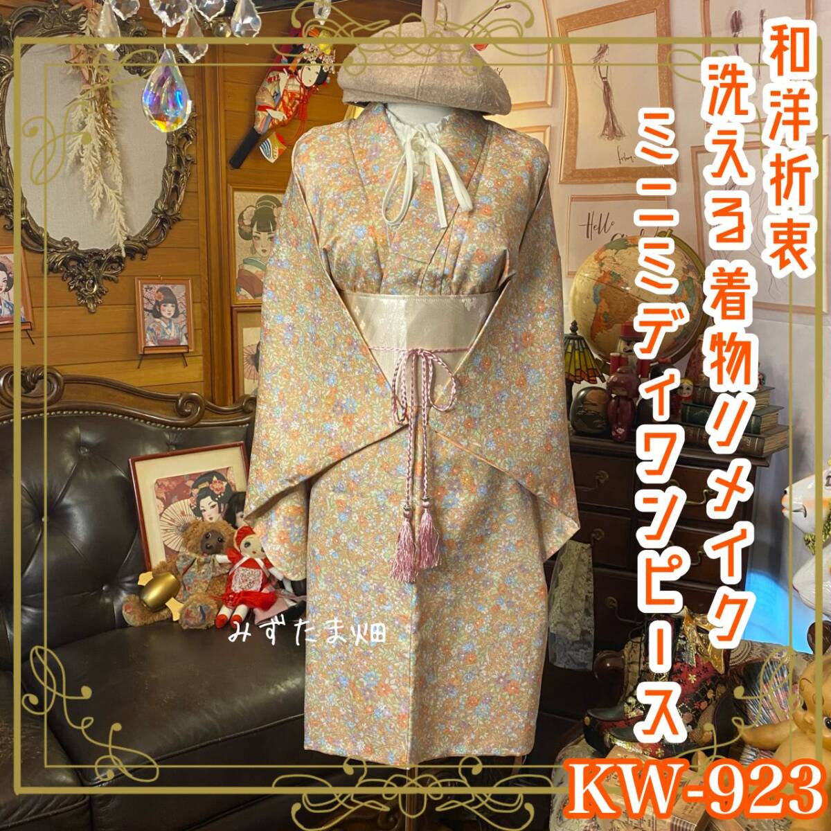 【着物 リメイク ミニミディ ワンピース ドレス 洗える 化繊 名古屋帯サッシュベルト 和洋折衷 レトロ 古着 ハンドメイド やさしい風に包まれて、花咲くひととき。 KW-923】