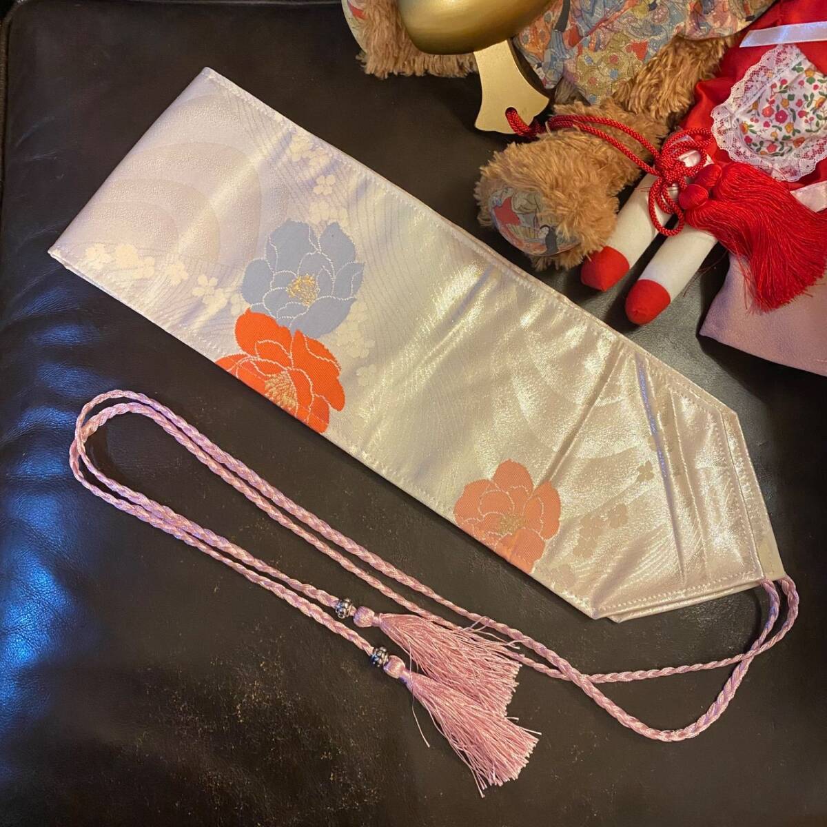 ピンクとラベンダーの帯紐がふわりと揺れて、