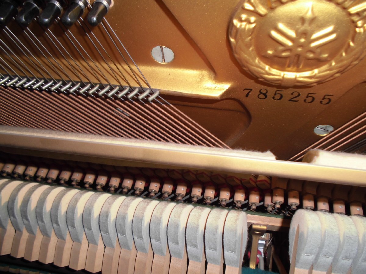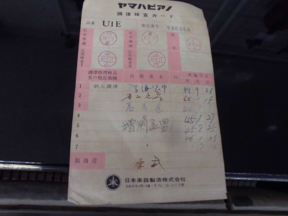 ヤマハピアノ U1E型です。ヤマハピアノの弾き易く、音色も良く、品質も安定したピアノです。大きさも高さ121cmの程の良い大きさのピアノです。製造年は昭和40年代の、ピアノが製造数が増え、世界一になる直前の日本楽器製造(株)の頃のピアノです。未だ贅沢税ともいわれた物品税が掛かっていました。ピアノそのものが高価でした。毛足の長い羊毛を使用したハンマー、柾目の積んだアラスカスプルースを使用した響板、部厚い木材を使用した外装材等々、一級の部材を使用して有ります。年月を経ておりますが、使用頻度は少なくハンマーや他の部品も摩耗は殆ど有りません。これからも充分の長い間お弾き頂けます。本物のピアノです。アクション・機械が入り、ピアノタッチ、フォルテからピアニッシモ迄鮮明に表現出来ます。電子ピアノでは決して表現出来ません。電子ピアノをお求めになられて、上達して、途中買い替えられなくても大丈夫です。長持ちします。もし、長持ちに不安がお有な方は2~3年間隔ででも調律をされる事をお勧めします。外装、塗装面の磨き出しを済ませてお届けします。掲載時には未完成ですが、調律から、ねじ締をは始め整調から、外装の磨き出しを済ませてお届けします。外装は磨き出しは未完成ながら、傷は少なく、比較的に綺麗です。このピアノにはデザインに特徴が有ります。裾回りの妻土台が狭くなっており、マンションでのコーナー90度に直角に曲がる処では、普通のデザインの妻土台では曲がり切れませんが、E型は回ります。このピアノに夜間や近隣の方に気兼ねなく練習出来るサイレンサーを取り付け出来ます。音止め装置を取り付けて、鍵盤下にセンサーを取付します。本体価格145,000円、取り付け費45,000円ですが、お求め時に取り付けられる場合には取り付け費を無料にて取付します。下見、試弾を歓迎します。お見えになられる前に一報下さい。店内以外に自社倉庫、運送会社倉庫等に分散しており、より確実です。お手元に届きましたら直ぐにお弾き頂けます様に、お子様にも成長に合わせて高低出来る椅子、トップカバー、敷物の丸台等6点お付けします。写真の見本を載せております。お届けします。関東一都6県から甲信越、中部、関西、北陸、東北地域にお住いの方で、1階・段差50cm位、階段5段位迄、マンションでエレベーターに載る等の比較的に平易な条件の方には自社便にて無料お届けをします。又、四国、北海道、九州方面へも少しの日にちを頂ければご相談に応じます。お届け時に不要になられた電子ピアノやエレクトーン、古~~いピアノ等をお引き取りします。