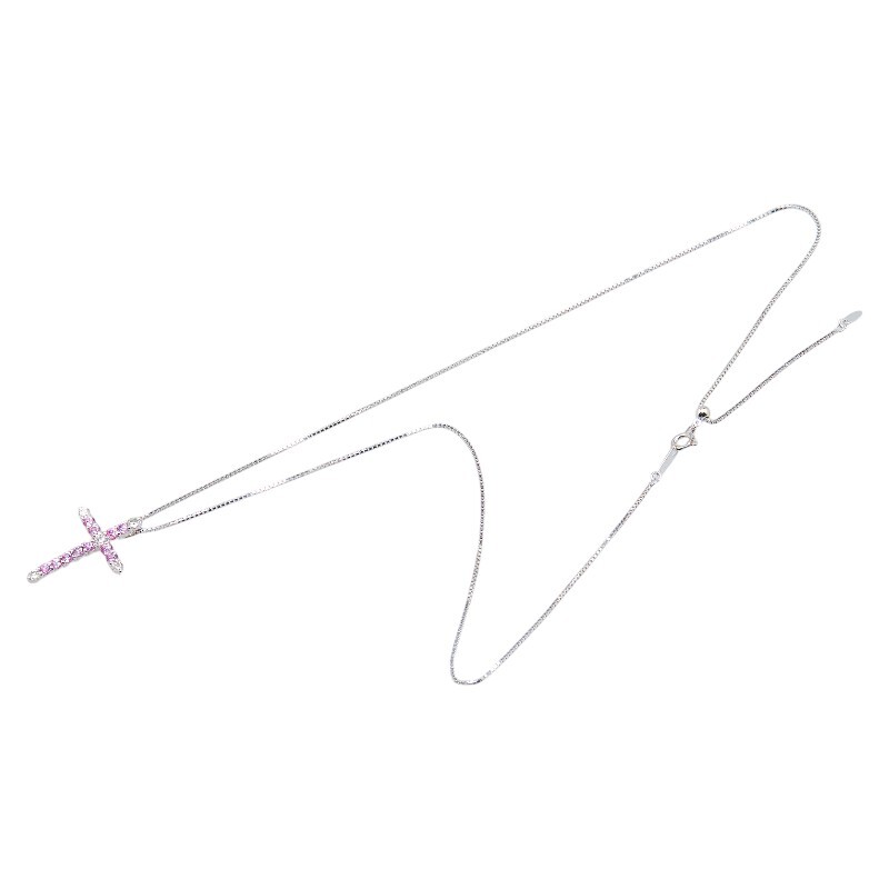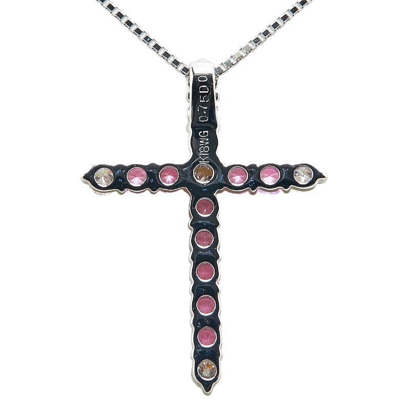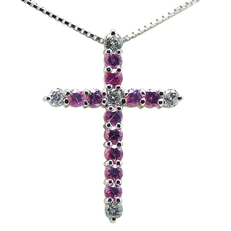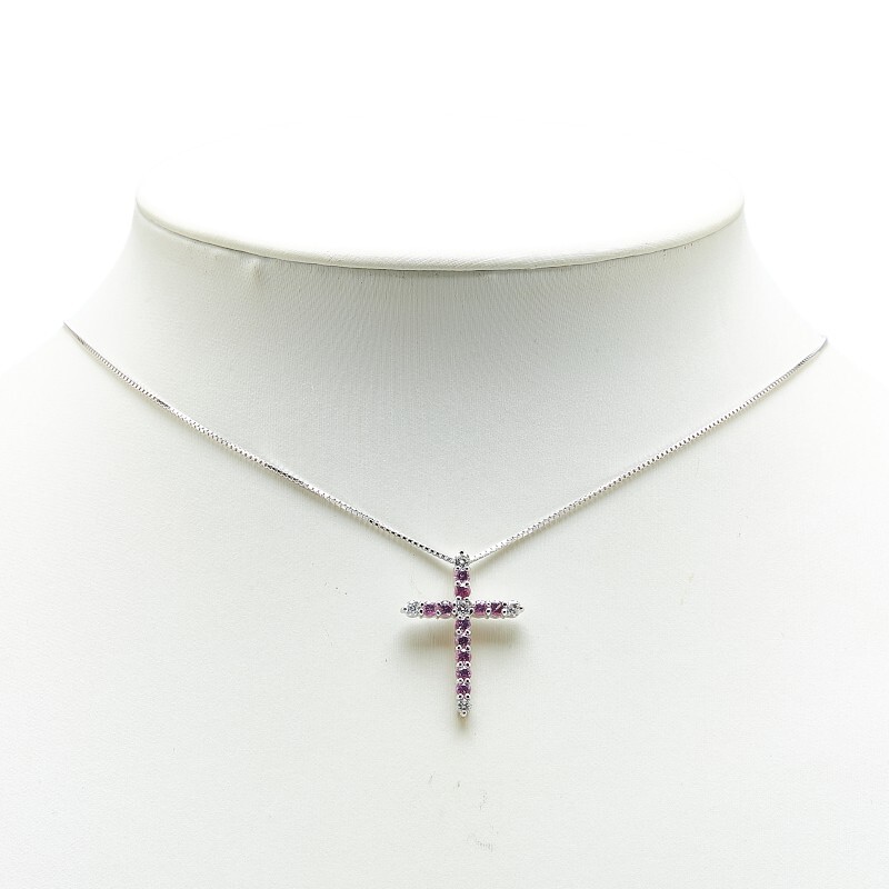 K18WG ホワイトゴールド ピンクサファイア0.75ct ダイヤ0.27ct クロス 十字架 モチーフ ベネチアン チェーン ネックレス レディース 中古