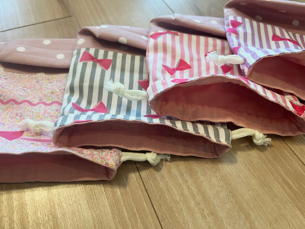 リボンの4種類の柄の綿生地で、コップ袋を4枚作りました。