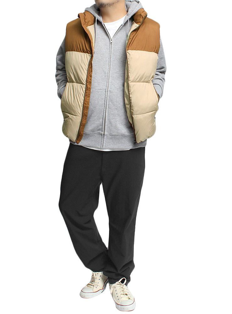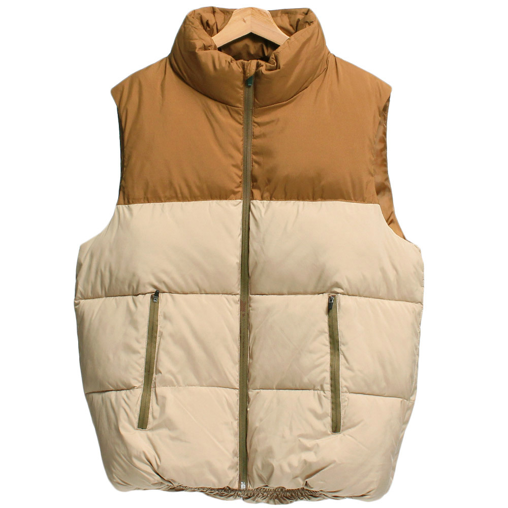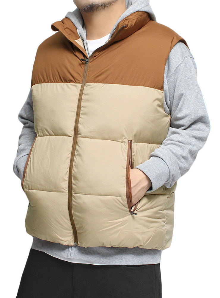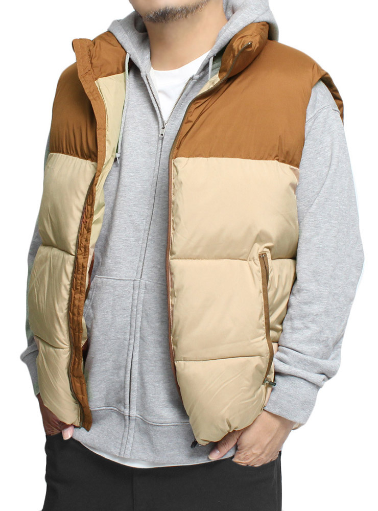 商品名 | 【新品】 4L ベージュ×ブラウン 中綿 ダウンベスト メンズ 大きいサイズ 撥水加工 軽量 ジップアップ ボリュームネック スタンド ジャケット |
