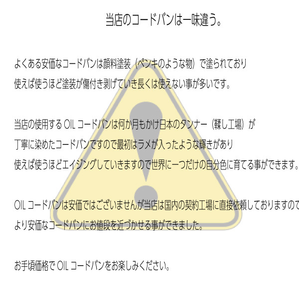 • 【コードバンについて】「コードバン」は革のダイアモンドと形容されるほどに表面は輝きを放ち、独特の風合いで人々を魅了します。また、牛革、豚革に比べ馬革は手に入りにくく希少価値が高くなります。良質な馬革を摂るには欧州の限定された地域で生産される農耕馬からしか摂ることができません。当店のコードバンは新喜皮革社製を使用しております。