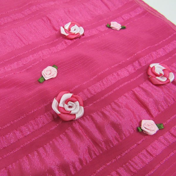 生地両端のたれ部分にリボンのバラ飾りが付いた兵児帯です