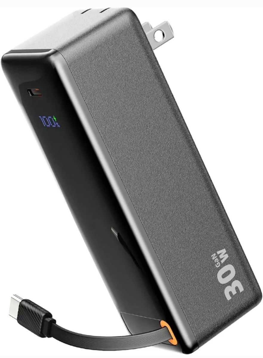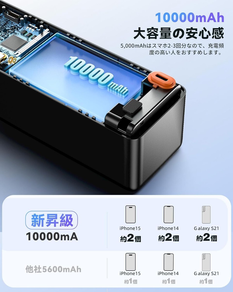 【内蔵タイプc付きモバイルバッテリー】Type-Cケーブルが内蔵されているモデルであれば、ケーブルを紛失するリスクも少ないので、安心して持ち運べます。ケーブルは耐久性に優れており、10,000回以上折り曲げても耐えると謳われています。USB Type-Cがポート搭載されており、最大2台同時充電が可能です。本体表面にはディスプレイを搭載し、バッテリーの残量や使用状況をリアルタイムかつ一目で確認可能。