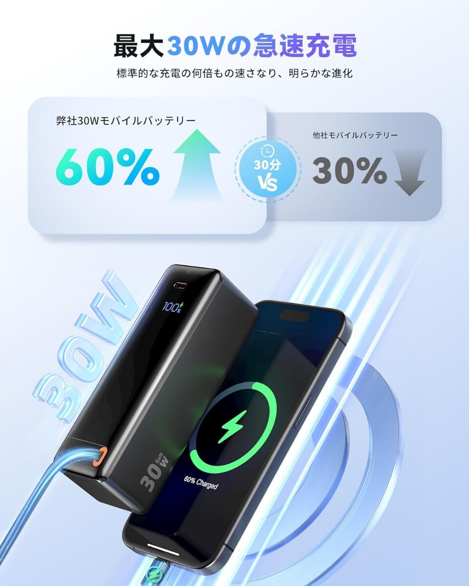 【GaNモバイルバッテリー:速さと安全性】化ガリウム(GaN)モバイルバッテリーは、高い電力変換効率により、驚くほど迅速な充電を実現します。さらに、優れた熱放散性能により、過熱リスクを効果的に低減し、デバイスの寿命を延ばします。環境に優しい化ガリウム(GaN)を使用しているため、持続可能な選択肢を提供し、あなたの生活をより良いものにします。この機会にぜひ、化ガリウムモバイルバッテリーで充電の新しい時代を体験してみてください!