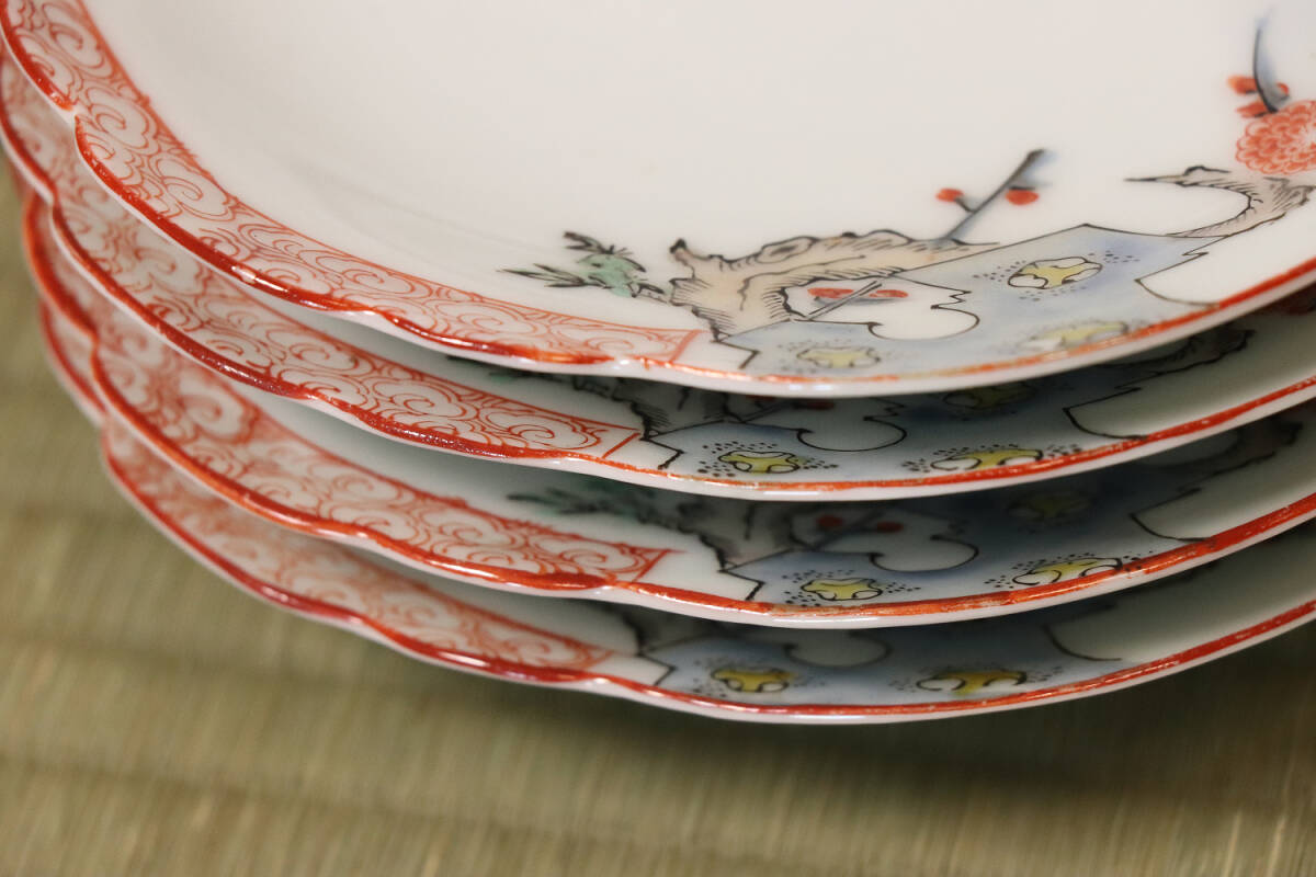 ◇【CM79】古い伊万里焼 柿右衛門手 鳳凰図 色絵中皿 四客 約15.5cm 変形皿 平皿 刺身皿 陶芸 陶磁器 和食器 有田◇