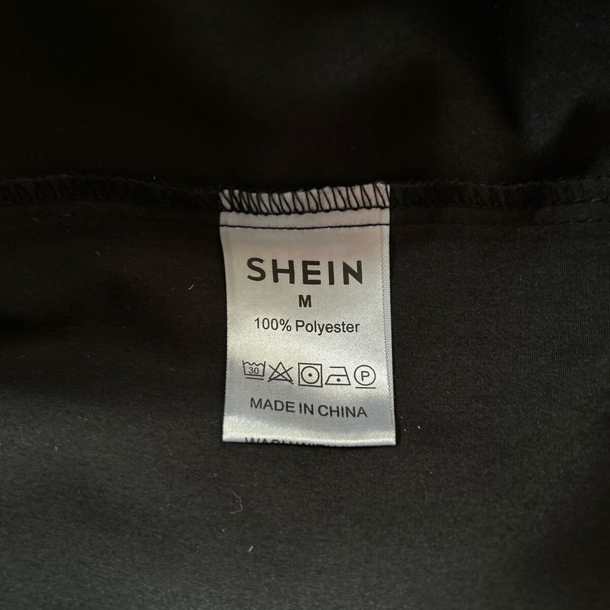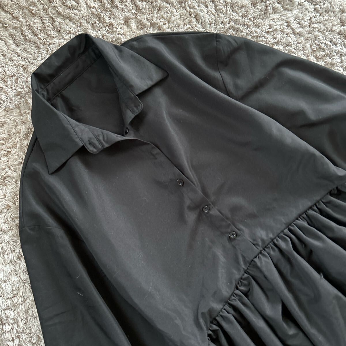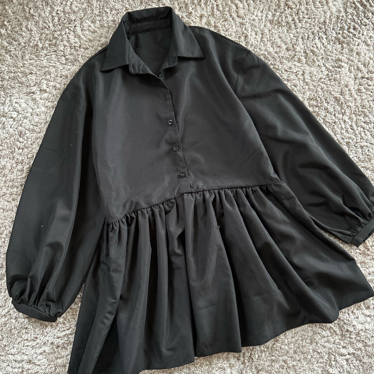 SHEINの光沢のある黒のシャツブラウス、バルーンスリーブとフレアデザインが特徴。