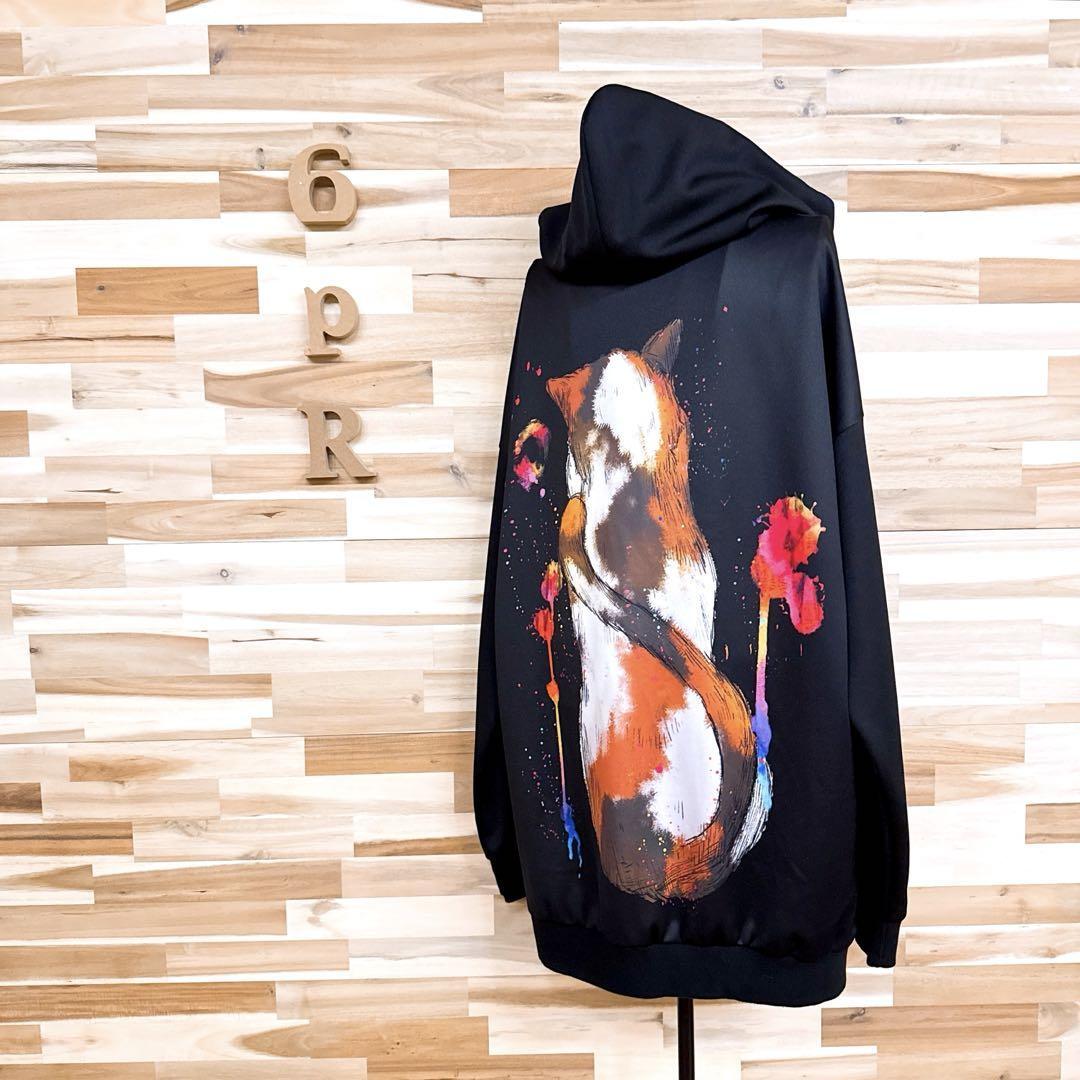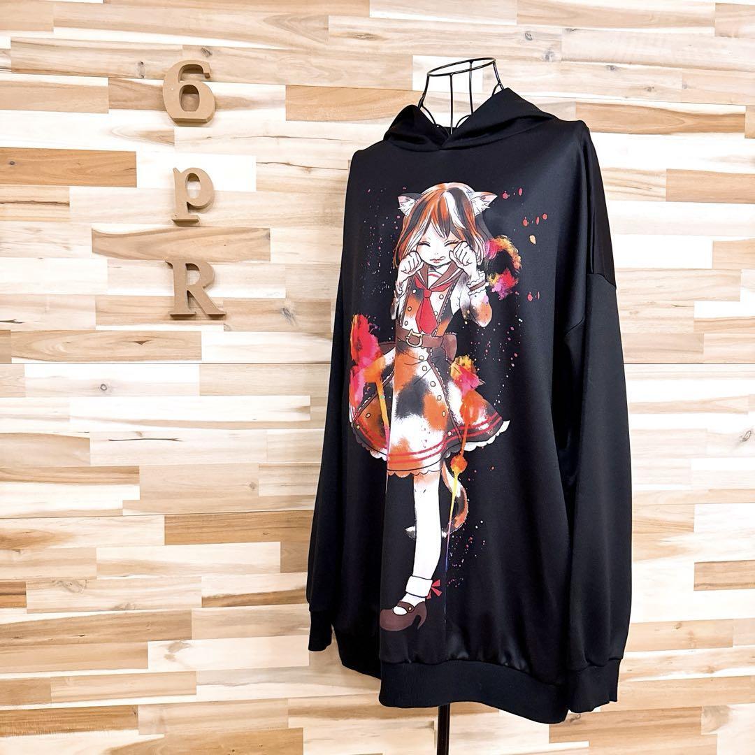 * アニマルトモダチ / プルオーバーパーカー *さらりとした素材感で、なめらかな肌触りが心地よく軽やかな一着。深みのあるブラックをベースに、フロントとバックに描かれた擬人化したネコ耳少女と三毛猫の大胆なプリント、鮮やかなアクセントカラーが周囲の目を惹く存在感を演出。ゆったりとしたオーバーサイズ感で、ラフに着こなせる、とっても可愛いankoROCKのパーカーです。※LGスタイラーにて除菌リフレッシュ・スチームクリーニング済みです。