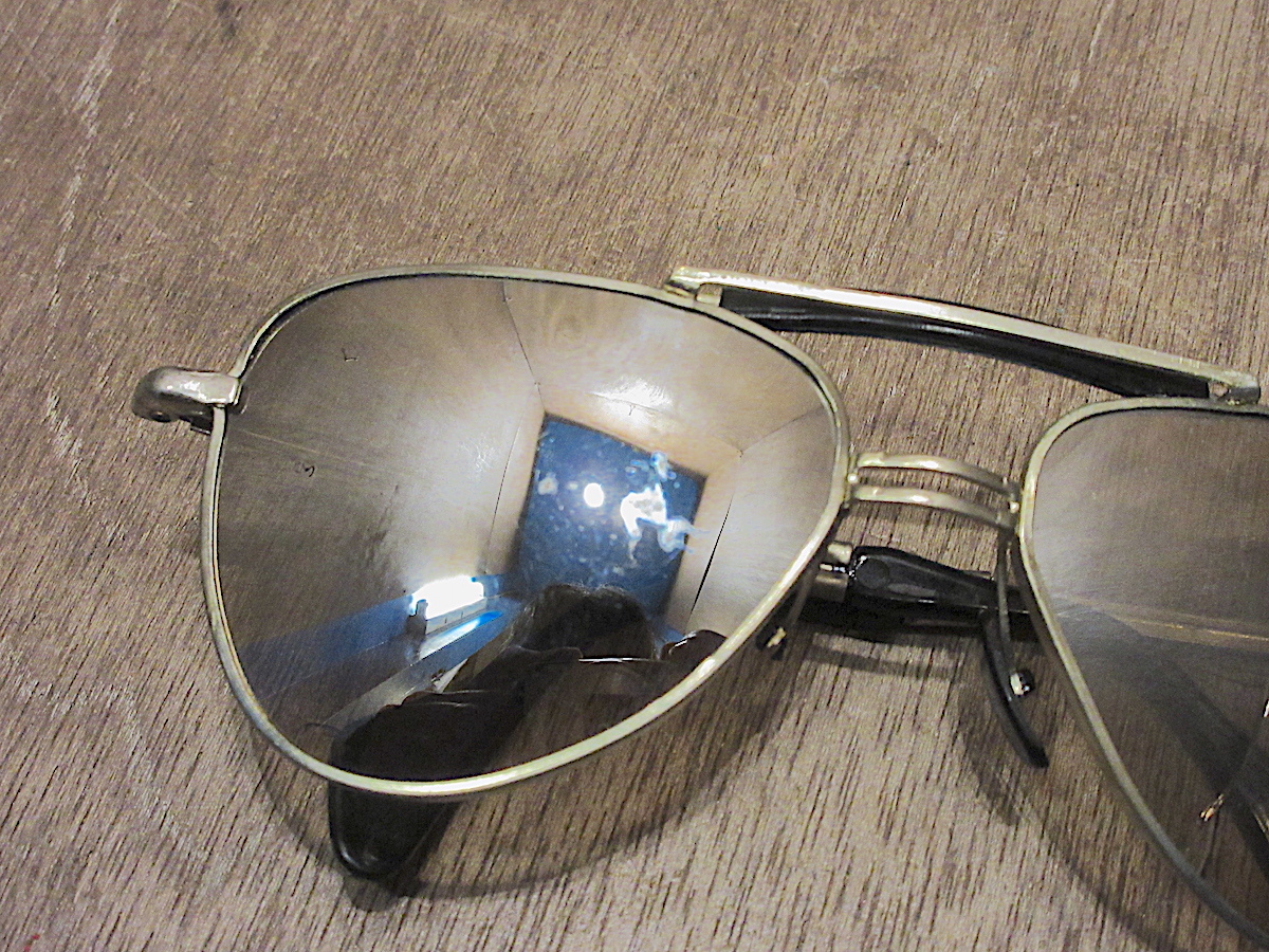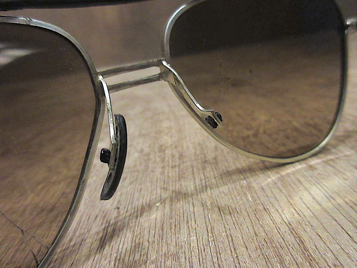 ノーズパッド部分欠損、左右テンプル部分にグラつき、左レンズ部分に割れ、右レンズ部分に汚れ、所々に傷、汚れ
