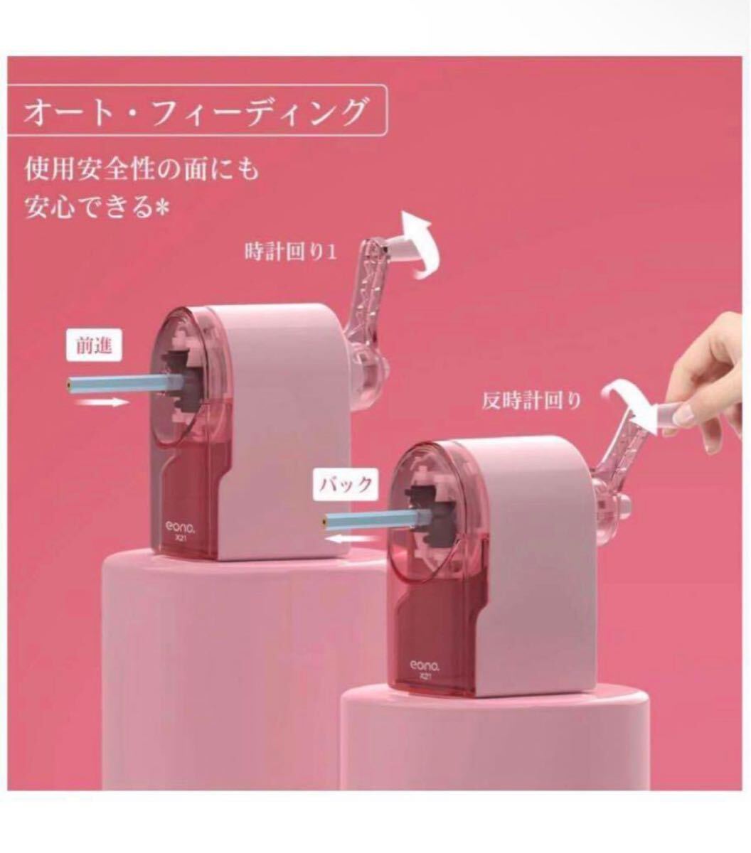 【オート・フィーディング】鉛筆を削り口に挿すと、ハンドルを回るだけで、鉛筆が自動で吸い込まれる。鉛筆挟み装置不要の上に、使用安全性の面にも安心できる。