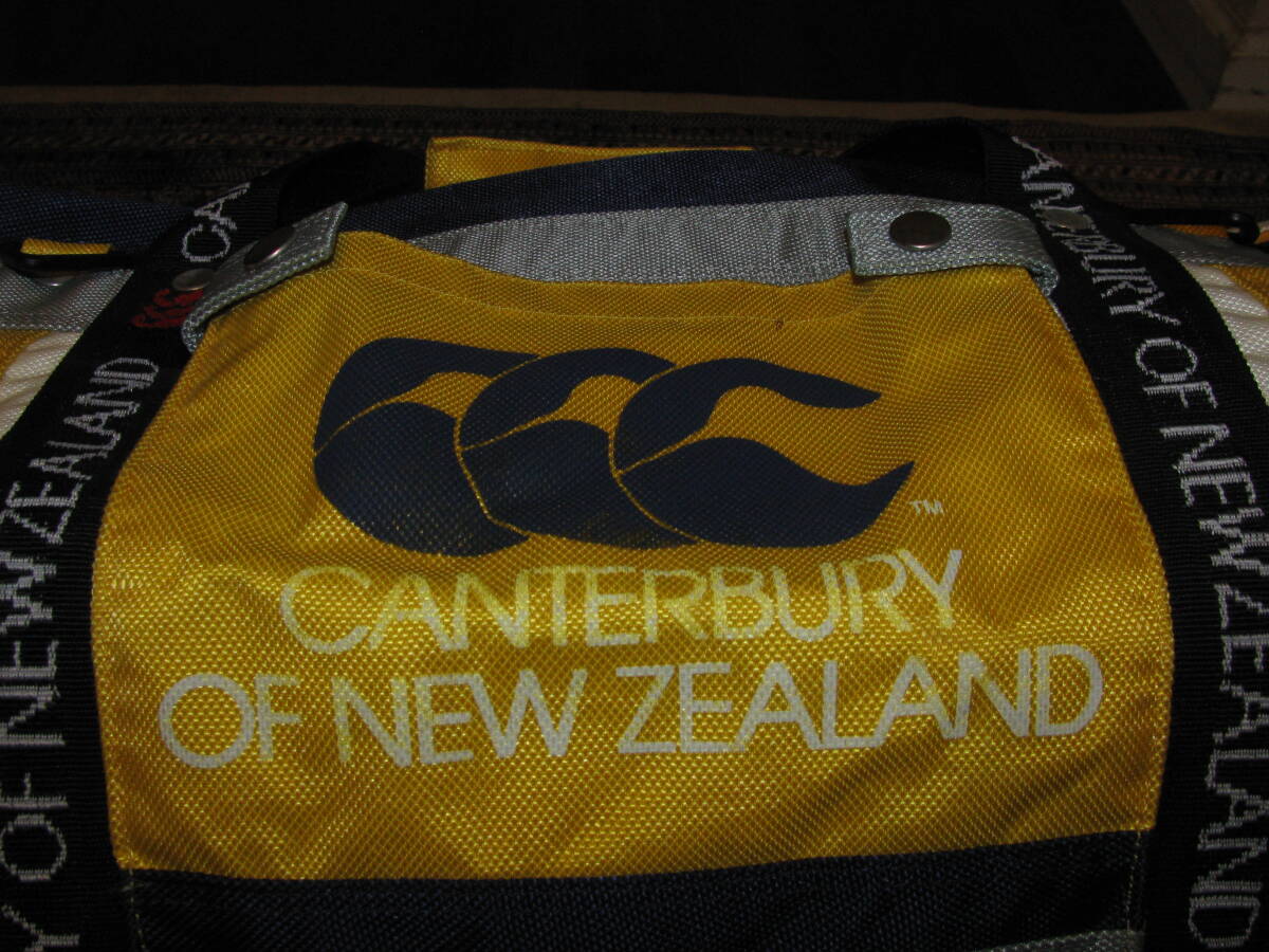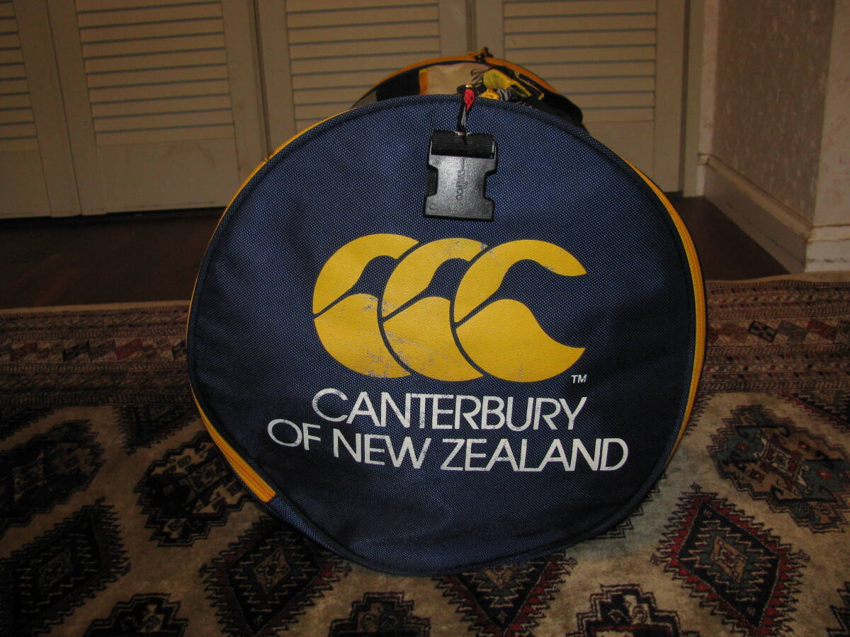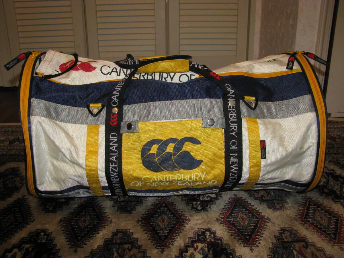 希少カンタベリーのドラムバッグです。色はホワイト系、サイズは約70X35X35㎝、左右にファスナー付き別室のシューズ収納部分があります。ショルダーベルトはありません。キズ、汚れなどあります、ご了承ください。送料1400円(北海道、沖縄1800円)でお送りいたします。