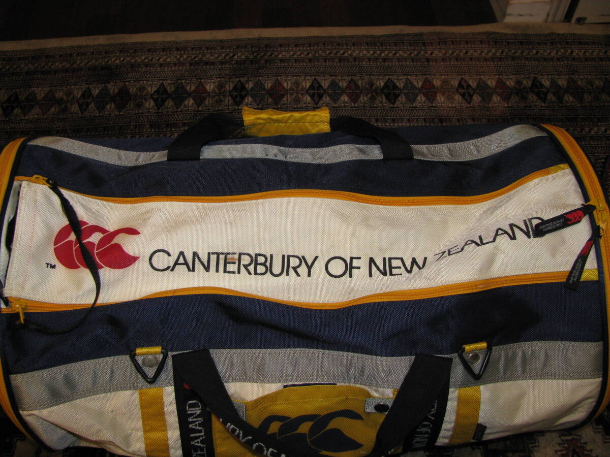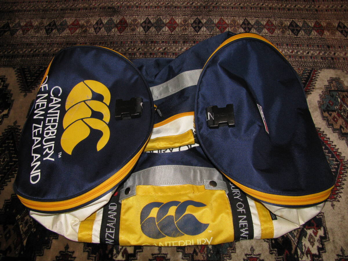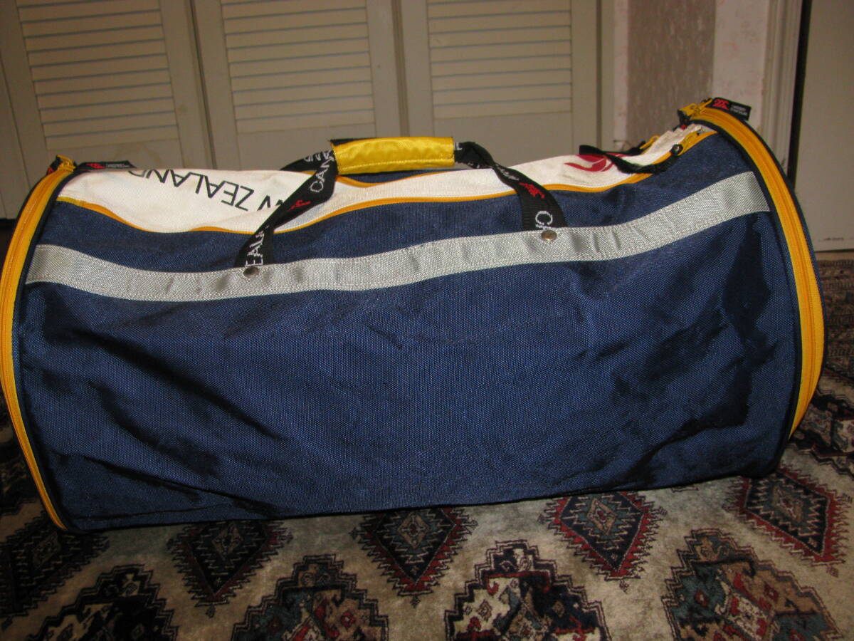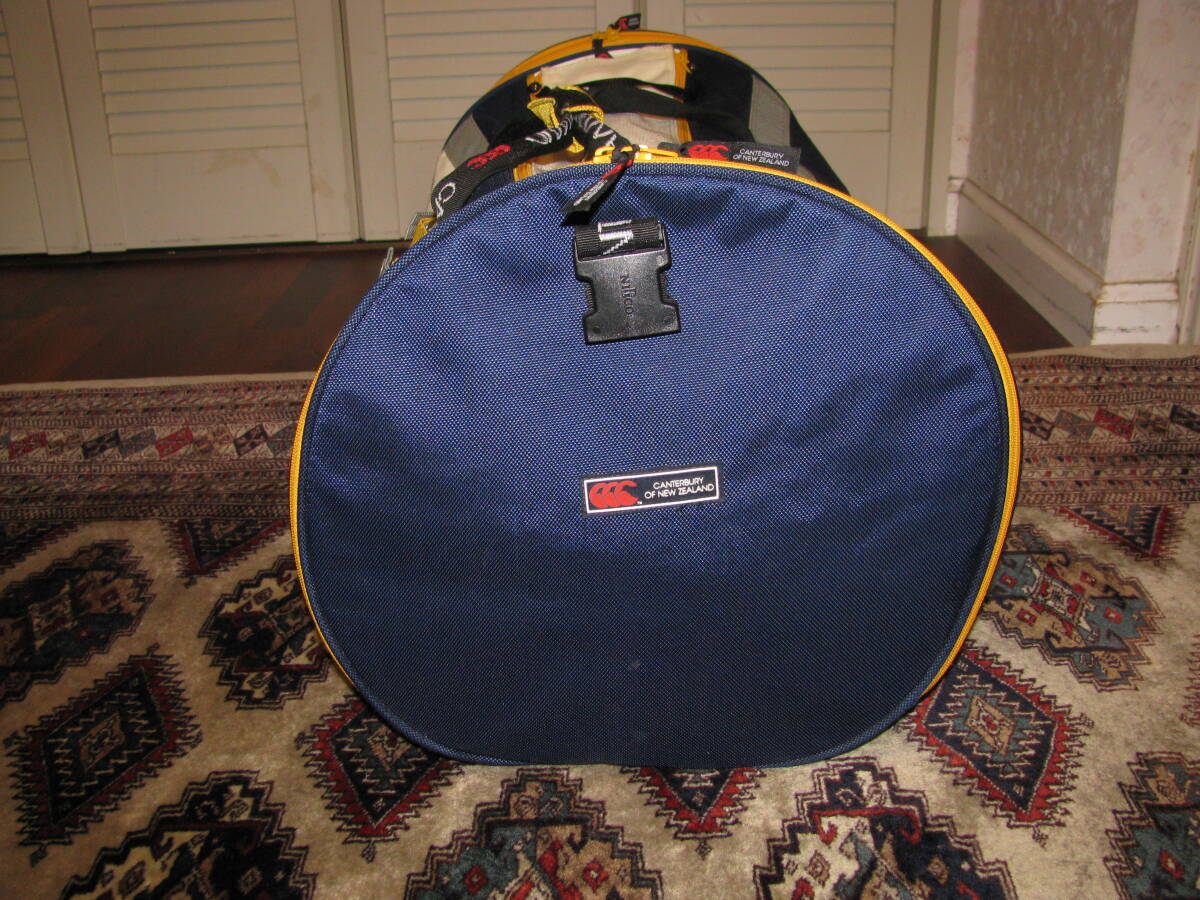 希少カンタベリーのドラムバッグです。色はホワイト系、サイズは約70X35X35㎝、左右にファスナー付き別室のシューズ収納部分があります。ショルダーベルトはありません。キズ、汚れなどあります、ご了承ください。送料1400円(北海道、沖縄1800円)でお送りいたします。