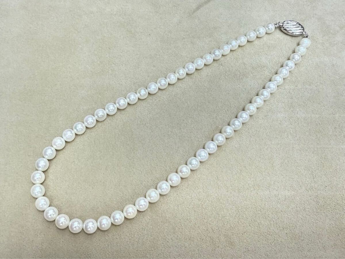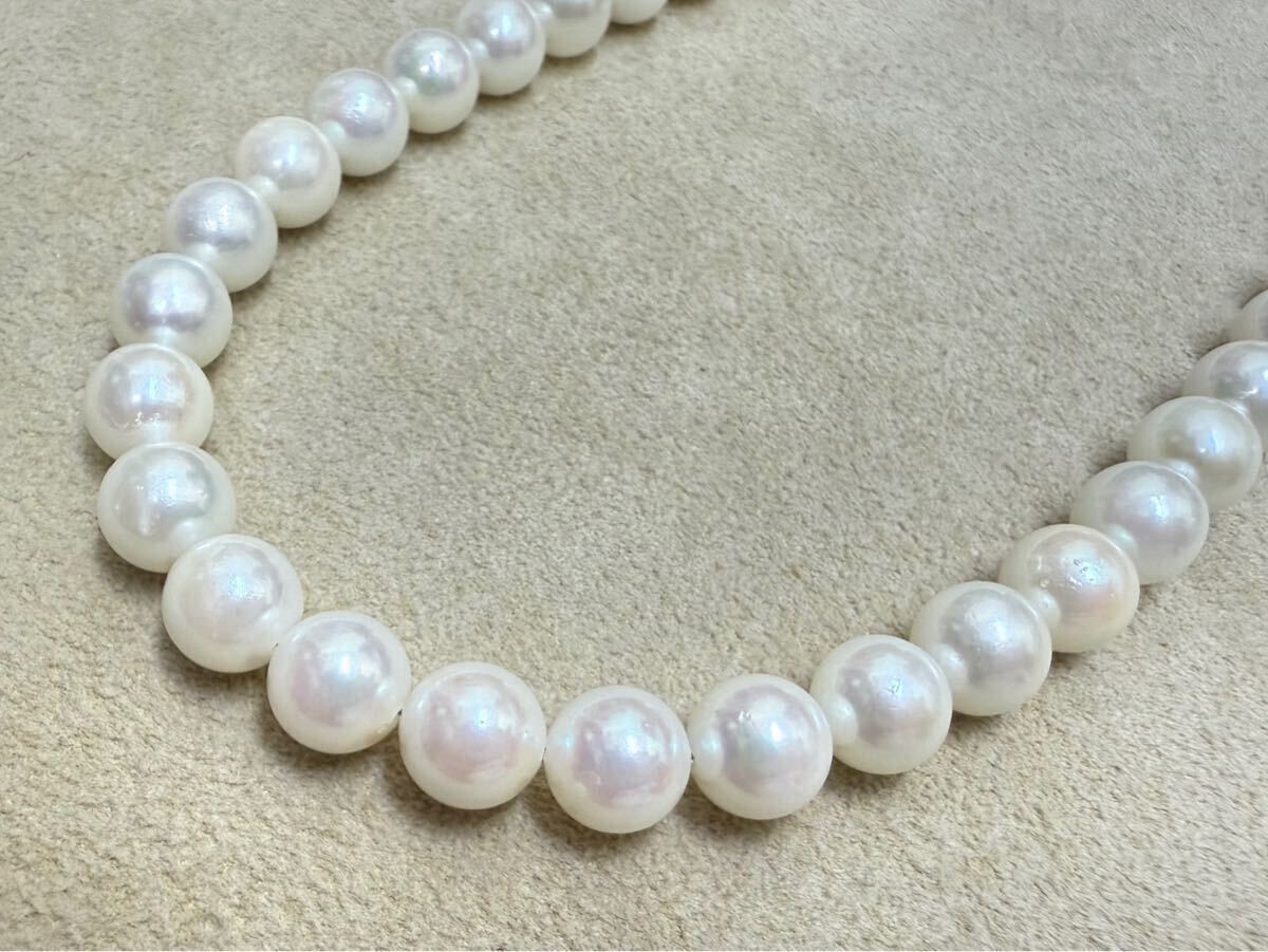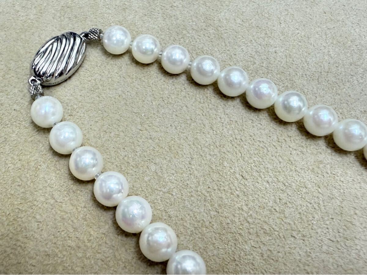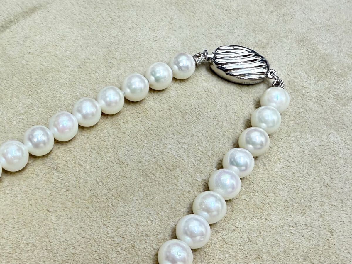 ホワイトからほんのりピンク系のテリはありますが、ややシワなどがあるアコヤ真珠のネックレスです。写真でご確認くださいませ。