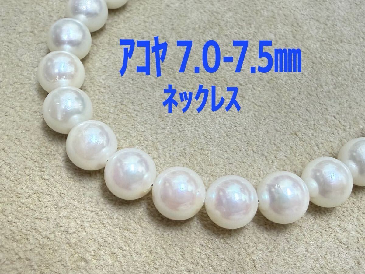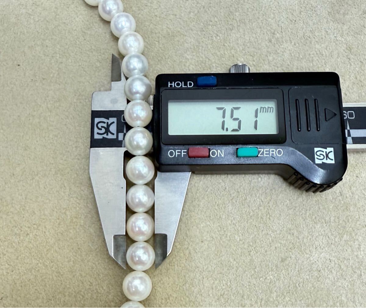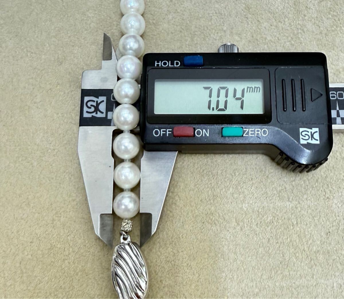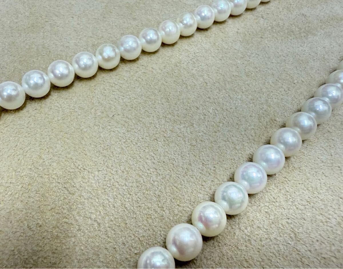 ホワイトからほんのりピンク系のテリはありますが、ややシワなどがあるアコヤ真珠のネックレスです。写真でご確認くださいませ。