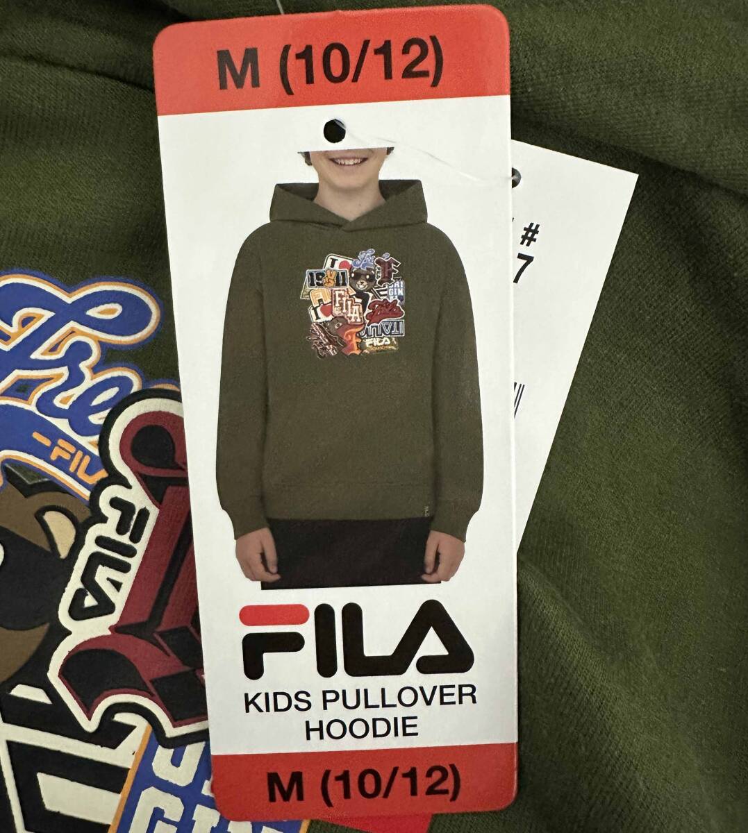 新品 140~150 ★ FILA フィラ ジュニア パーカー トレーナー カーキ 10/12 プルオーバー フーディ 3D エンボス コストコ ボーイズ ガールズ