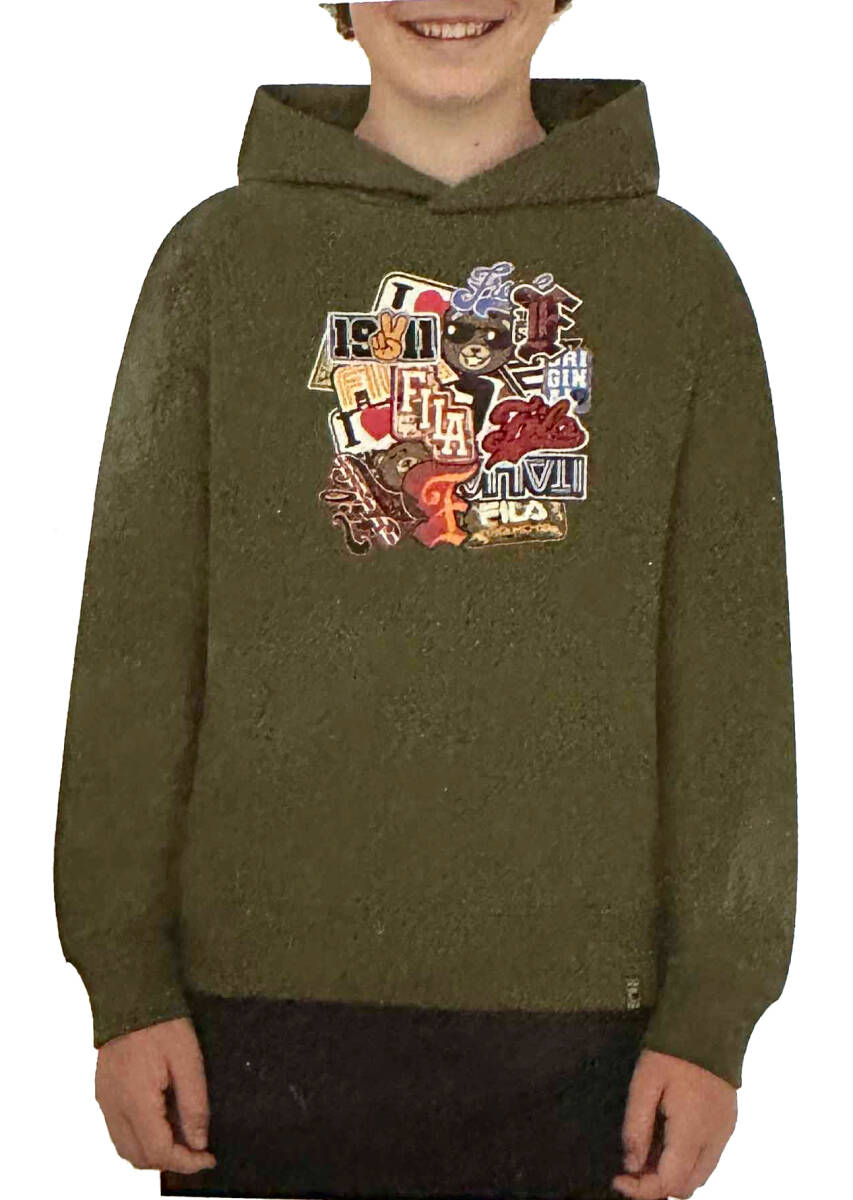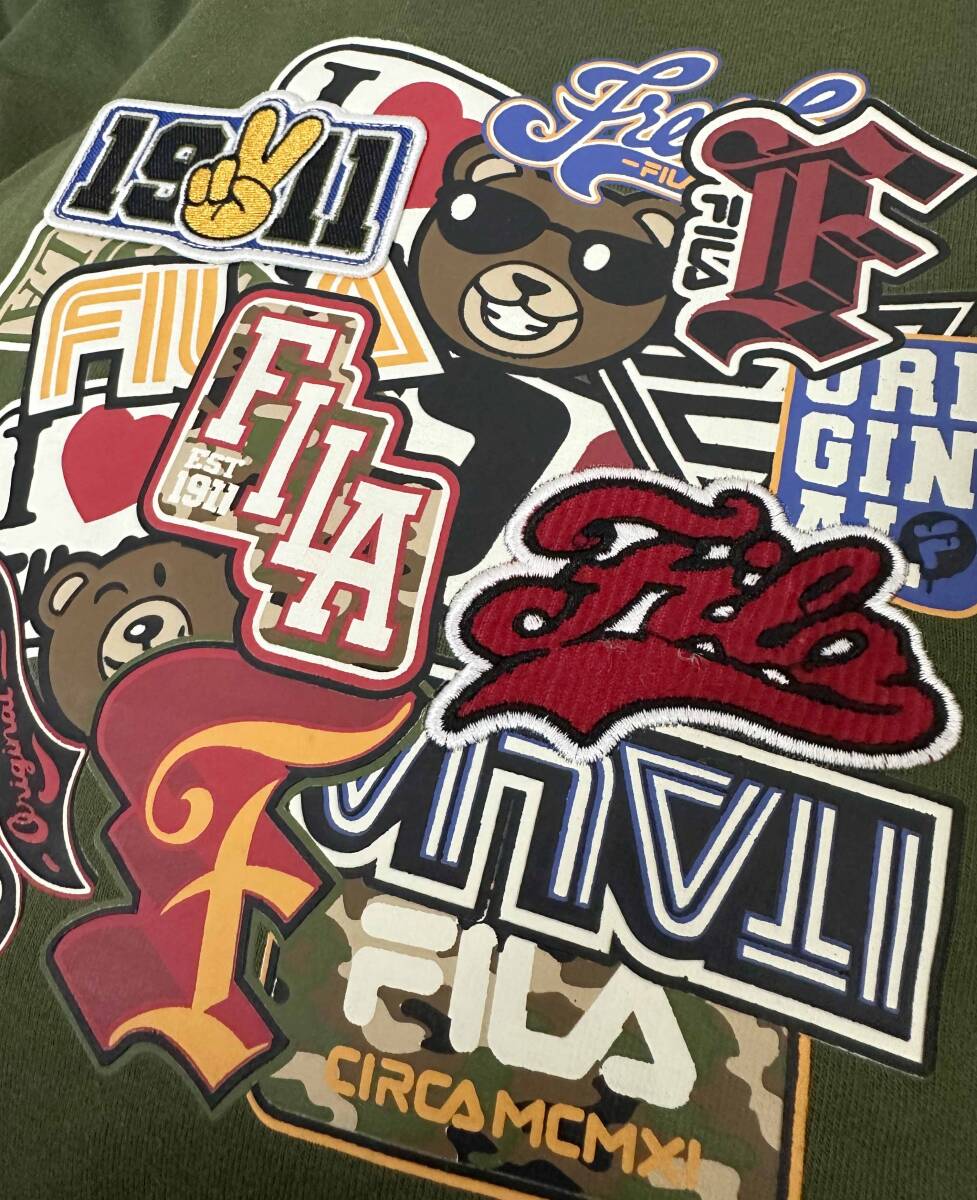 たくさんのFILAのワッペンが重なったようなイラストが目を引くパーカーです。