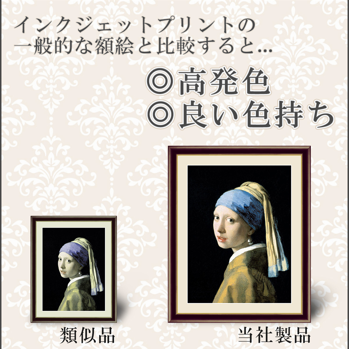 世界の有名 美術館 が レプリカ を制作するため採用している最先端ジグレ版画技法で特性新絹本画布に表現し、最終仕上げは手彩による補色( 手彩補色 )が加えられ、リアルな雰囲気を醸し出しています。光や空気中のオゾンなどに分解されにくい 対候性 を備えており、時間がたっても色調が変化しにくく、美しさが変わりません。