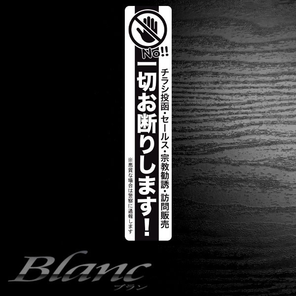 しつこい迷惑で悪質な訪問者に一切お断りステッカー! セールスマン、防犯対策、訪問販売、宗教勧誘、新聞勧誘、NHKに効果てきめん! ポストやインターフォン、玄関ドア付近にご利用ください。 ◎この商品は文字変更・サイズ変更ができません◎ 落札価格は1枚の価格です。 ●サイズ:縦150mm×横30mm ●耐候年数:3~5年 ●UV加工、防水加工 |