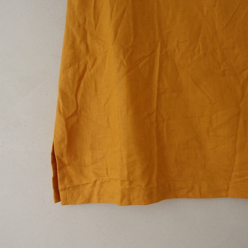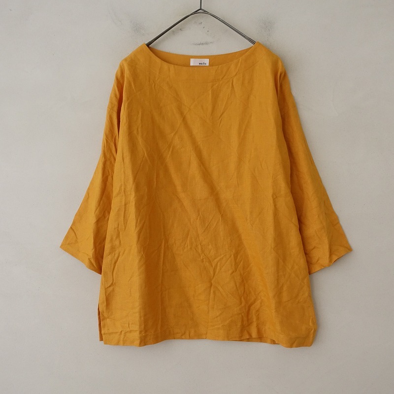 | wafuのリネンボートネックプルオーバーブラウスです。カラーは山吹色です。程よく厚みがある麻生地を使用。透け感はなく、麻特有の糸節・ネップ・艶・シワなどが見受けられるナチュラルな素材です。見返しとステッチを配したボートネックのプルオーバー仕様で、ウエストラインを配し裾広がりに仕立てられ、裾サイドはスリット入りのデザインです。ポケットはございません。 |
