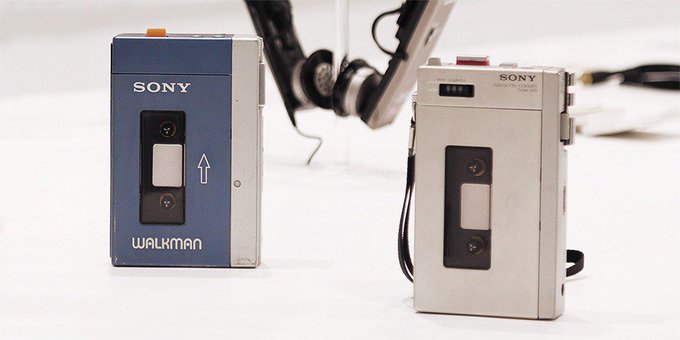 写真右の「プレスマン」から録音機能を取り、ステレオ再生機能を追加し、初代「ウォークマン」は誕生しました。(1978年)