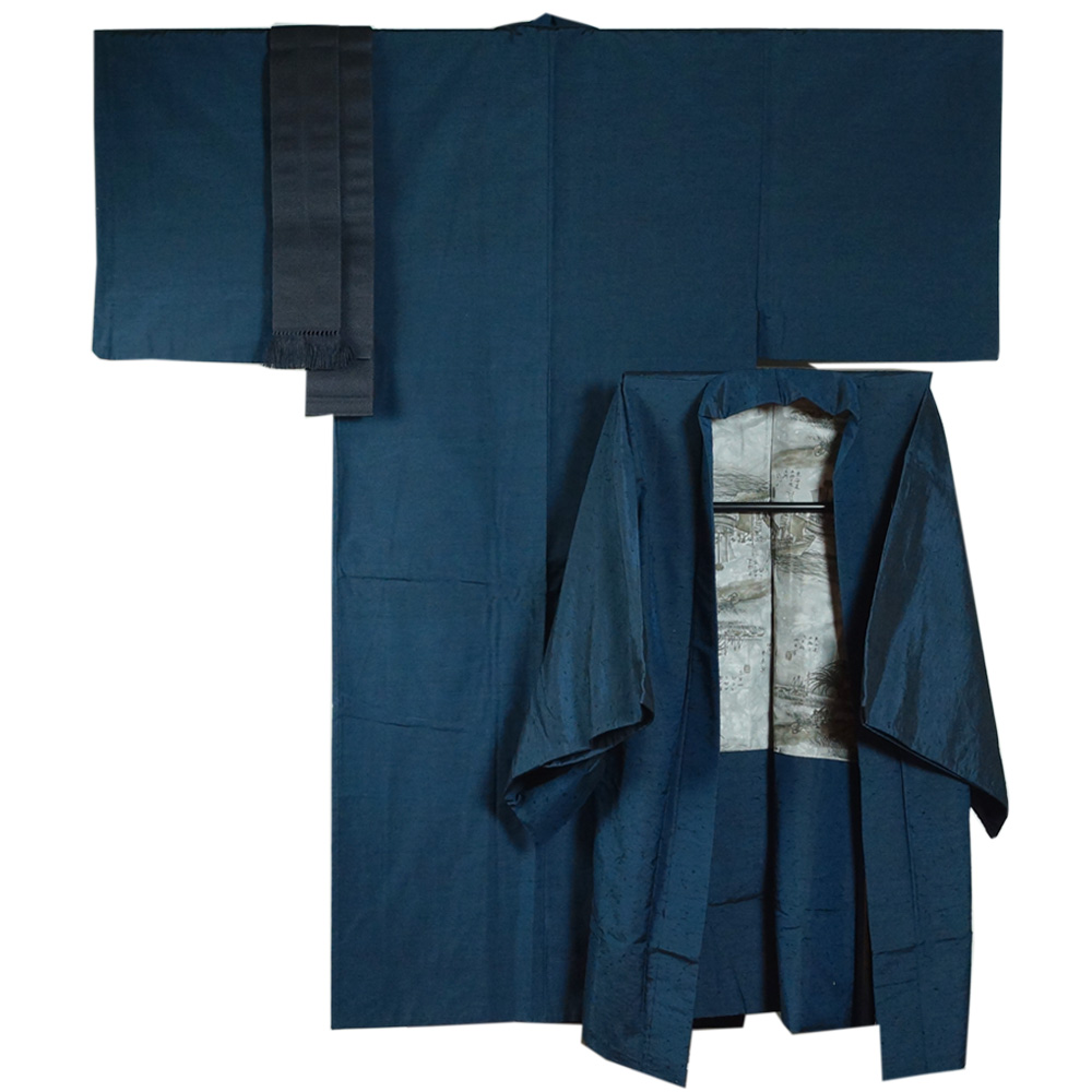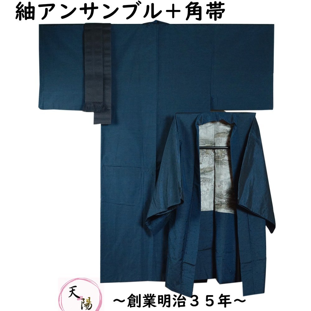 | 品 名 | 男着物 紬 アンサンブル 着物・羽織・角帯 セット ひげ紬 濃紺色系 無地 Mサイズ 【男着物 中古 紬 正絹 メンズ 着物 メンズ着物 アウトレット 着物 リサイクル着物 男物 】 | ||
